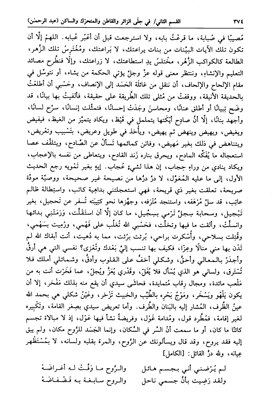 مصيبا في صبابة، ما قرعت بابه، ولا استرجعت قبل أن أعبر عبابه. اللهمّ إلّا أن تكون تلك الآيات البيّنات من بنات يراعتك، لا براعتك، ومغترس تلك الزّهر، الطالعة كالكواكب الزّهر، مختلس يد استطاعتك، لا زراعتك، وإلّا فنطّرح مصائد التعليم والإنشاء، وننتظر معنى قوله عزّ وجلّ يؤتي الحكمة من يشاء، أو نتوسّل في مقام الإلحاح والإلحاف، أن ننقل من غائلة الحسد إلى الإنصاف، وحسبي أن أطلعت بالحديقة الأنيقة، ووقفت من مثلى تلك الطّريقة على حقيقة، فألفيت بها بيانا، قد وضح تبيانا أو أطلق عنانا، ومحاسن وجدت إحسانا، فتمثّلت إنسانا، سرّح لسانا، وأجهد بنانا، إلّا أنّ صادح أيكتها يتململ في قيظ، ويكاد يتميّز من الغيظ، فيفيض ويغيض، ويهيض وينهض ثم يهيض، ويأخذ في طويل وعريض، بتسبيب وتعريض، ويتناهض في ذلك بغير مهيض، وفاتن كمائمها تسأل عن الصّادح، ويتلقّف عصا استعجاله ما يفكّه المادح، ويحرق بناره زند القادح، ويتعاطى من نفسه بالإعجاب، ويكاد ينادي من وراء حجاب، إن هذا لشيء عجاب. إيه بغير تمويه رجع الحديث الأول، إلى ما عليه المعوّل، لا درّ درّها من نصيحة غير صحيحة، ووصيّة مودّة صريحة، تعلقت بغير ذي قريحة، فهي استعجلتني بداهية كاتب، واستطالة ظالم عاتب، قد سلّ مرهفه، واستنجد مترفه، وجهّزها نحو كتيبته تسفر عن تحجيل، بغير تبجيل، وسحابة سجلّ ترمي بسجّيل، ما كان إلّا أن استقلّت، ورمتني بدائها وانسلّت، وألقت ما فيها وتخلّت، فحسبي الله تغلّب على فهمي، ورميت بسهمي، وقتلت بسلاحي، وأسكرت براحي، برئت برئت، مما به دهيت، أنت أبقاك الله لم تدن بها مني منالا وعزّا، فكيف بها تنسب إليّ بعدك وتعزى؟ نفسي التي هي أرقّ وأجدر بالمعالي وأحقّ، وشكلي أخفّ على القلوب وأدقّ، وشمائلي أملك فلا تسترق، ولساني هو الذي يسأل فلا يفلّ، وقدري يعزّ ويجلّ، عما فخرت أنت به من ملعب مائدة، ومجال رقاب متمايدة، فحاشى سيدي أن يقع منه بذلك مفخر، إلا أن يكون يلهو ويسخر، وموج بحره بالطّيّب والخبيث تزخر، وعين شكلي هي بحمد الله عين الظّرف، المشار إليه بالبنان والطّرف. وأما تعريض سيدي بصغر القامة، وتكبيره لغير إقامة، فمطّرد قول، ومدامة غول، وفريضة نشأ فيها عول، إذ لا مبالاة تجسم كائنا ما كان، أو ما سمعت أنّ السّر في السّكان، وإنما الجسد للرّوح مكان، ولم يبق إليه فقد يروح، وقد قال ويسألونك عن الرّوح، والمرء بقلبه ولسانه، لا بمستظهر عيانه، ولله درّ القائل: [الكامل]