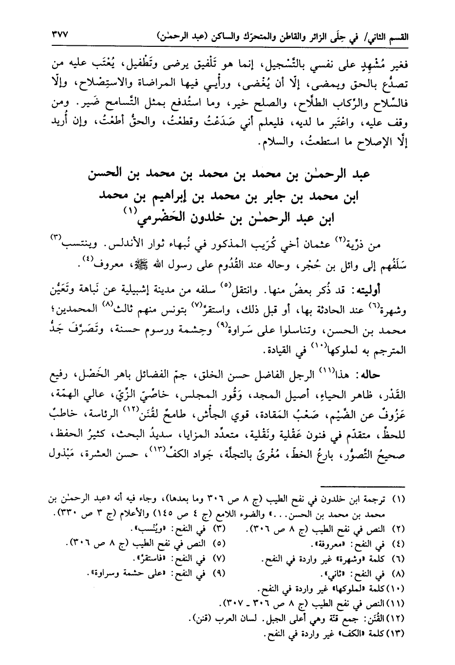 حاله: هذا «11» الرجل الفاضل حسن الخلق، جمّ الفضائل باهر الخصل، رفيع القدر، ظاهر الحياء، أصيل المجد، وقور المجلس، خاصّيّ الزّيّ، عالي الهمّة، عزوف عن الضّيم، صعب المقادة، قوي الجأش، طامح لقنن «12» الرئاسة، خاطب للحظّ، متقدّم في فنون عقلية ونقلية، متعدّد المزايا، سديد البحث، كثير الحفظ، صحيح التّصوّر، بارع الخطّ، مغرى بالتجلّة، جواد الكفّ «13» ، حسن العشرة، مبذول