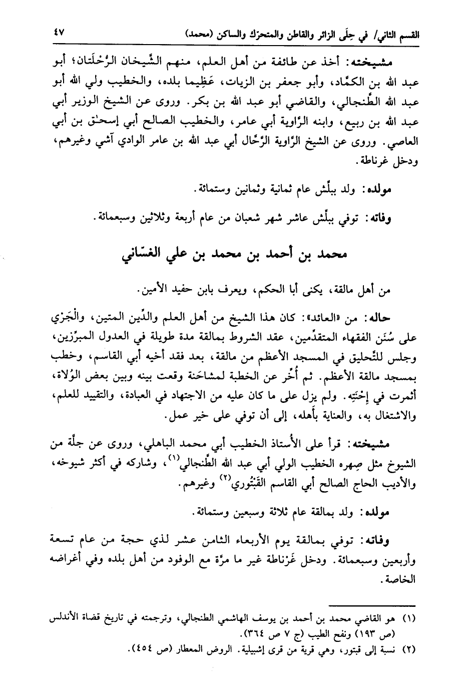 حاله: من «العائد» : كان هذا الشيخ من أهل العلم والدّين المتين، والجري على سنن الفقهاء المتقدّمين، عقد الشروط بمالقة مدة طويلة في العدول المبرّزين، وجلس للتّحليق في المسجد الأعظم من مالقة، بعد فقد أخيه أبي القاسم، وخطب بمسجد مالقة الأعظم. ثم أخّر عن الخطبة لمشاحنة وقعت بينه وبين بعض الولاة، أثمرت في إحنته. ولم يزل على ما كان عليه من الاجتهاد في العبادة، والتقييد للعلم، والاشتغال به، والعناية بأهله، إلى أن توفي على خير عمل.