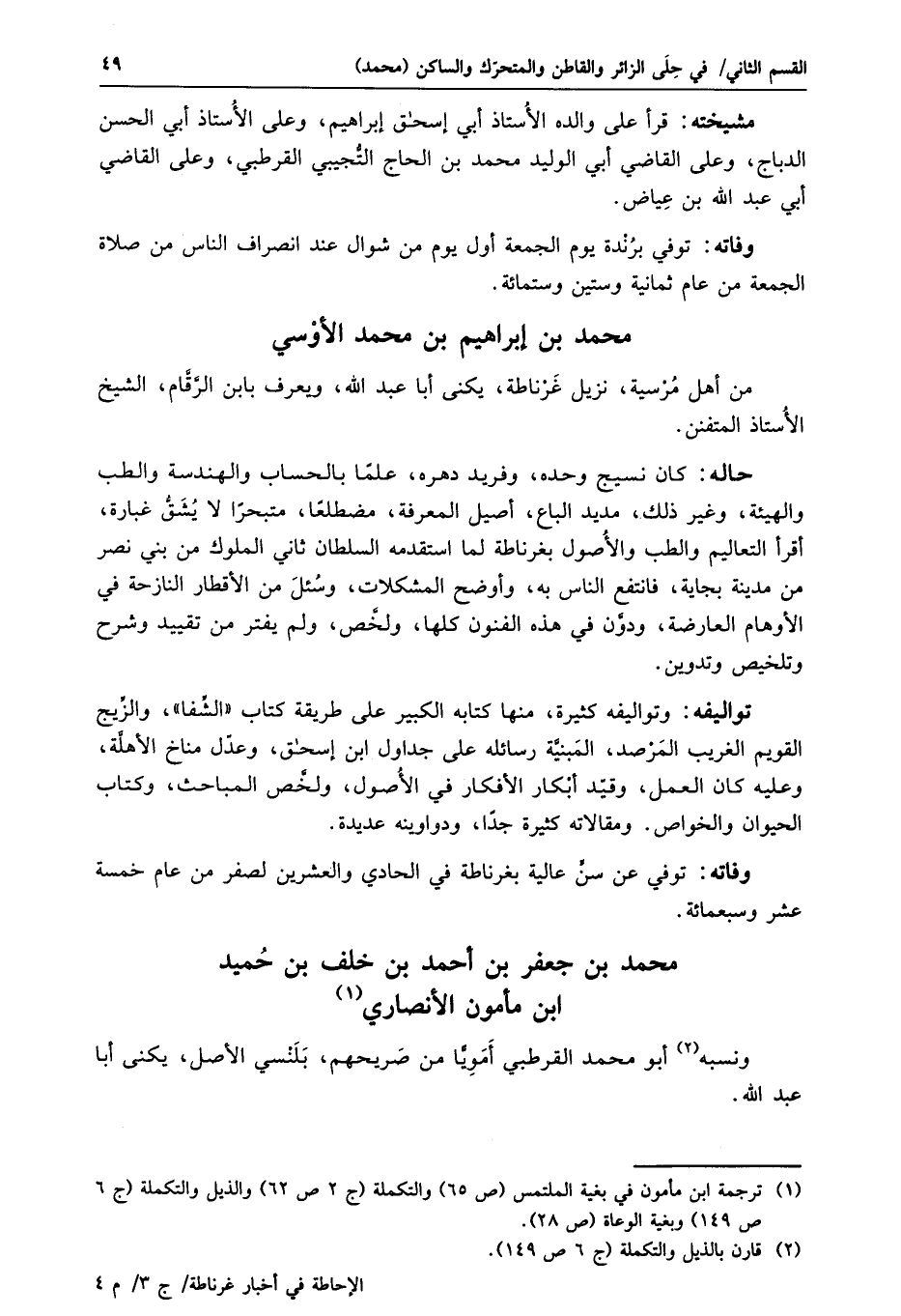 ونسبه «2» أبو محمد القرطبي أمويّا من صريحهم، بلنسي الأصل، يكنى أبا عبد الله.