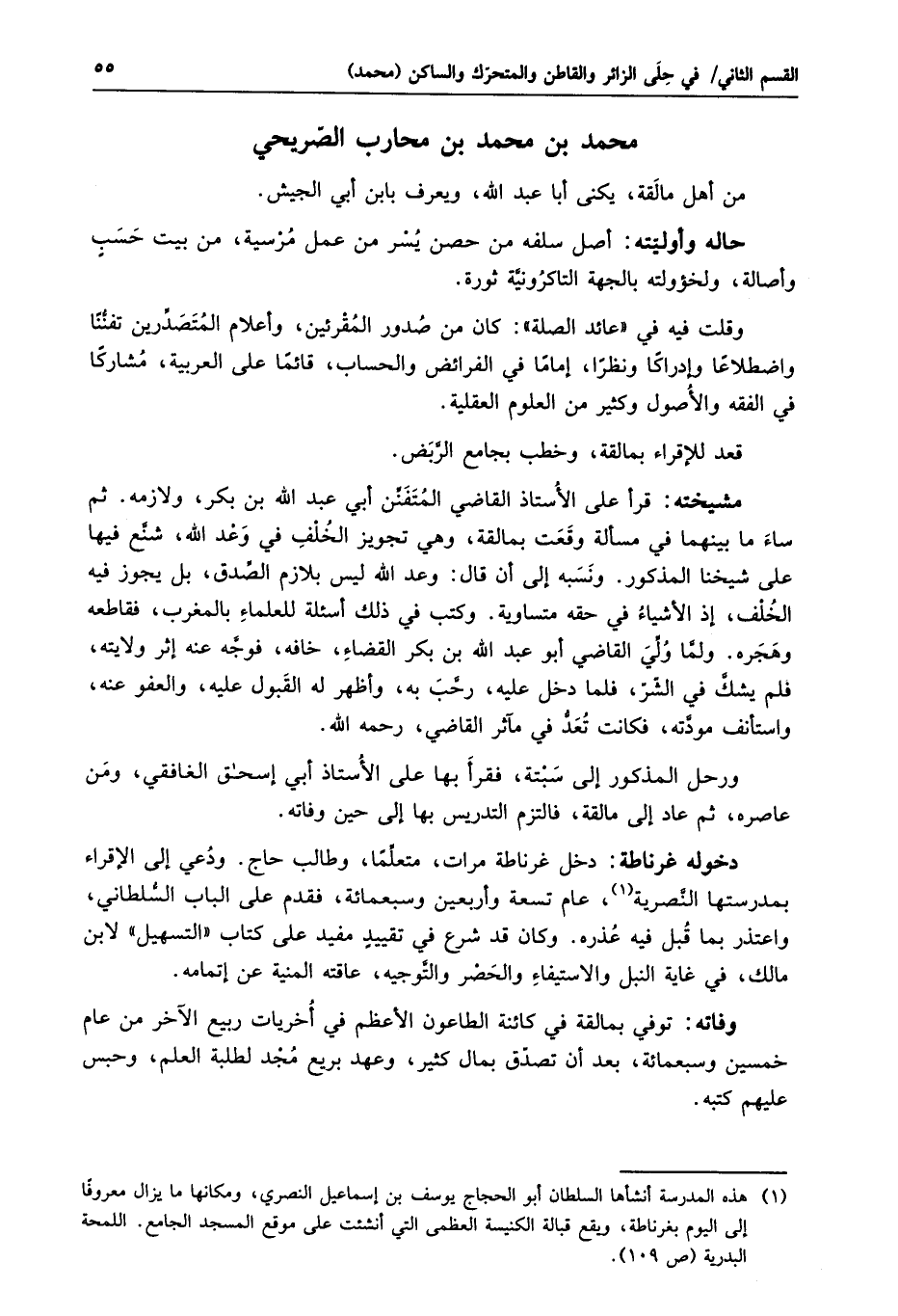 دخوله غرناطة: دخل غرناطة مرات، متعلّما، وطالب حاج. ودعي إلى الإقراء بمدرستها النّصرية «1» ، عام تسعة وأربعين وسبعمائة، فقدم على الباب السّلطاني، واعتذر بما قبل فيه عذره. وكان قد شرع في تقييد مفيد على كتاب «التسهيل» لابن مالك، في غاية النبل والاستيفاء والحصر والتّوجيه، عاقته المنية عن إتمامه.
