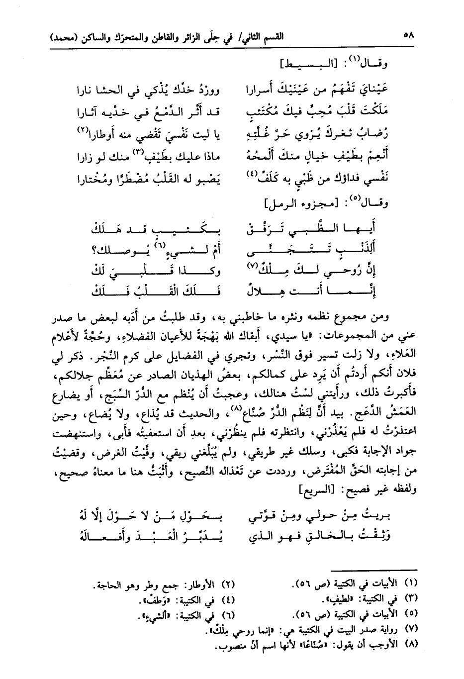 ومن مجموع نظمه ونثره ما خاطبني به، وقد طلبت من أدبه لبعض ما صدر عني من المجموعات: «يا سيدي، أبقاك الله بهجة للأعيان الفضلاء، وحجّة لأعلام العلاء، ولا زلت تسير فوق النّسر، وتجري في الفضائل على كرم النّجر. ذكر لي فلان أنكم أردتم أن يرد على كمالكم، بعض الهذيان الصادر عن معظّم جلالكم، فأكبرت ذلك، ورأيتني لست هنالك، وعجبت أن ينظم مع الدّرّ السّبج، أو يضارع العمش الدّعج. بيد أنّ لنظم الدّرّ صنّاع «8» ، والحديث قد يذاع، ولا يضاع، وحين اعتذرت له فلم يعذرني، وانتظرته فلم ينظرني، بعد أن استعفيته فأبى، واستنهضت جواد الإجابة فكبى، وسلك غير طريقي، ولم يبلّغني ريقي، وفّيت الغرض، وقضيت من إجابته الحقّ المفترض، ورددت عن تعذاله النّصيح، وأثبتّ هنا ما معناه صحيح، ولفظه غير فصيح: [السريع]