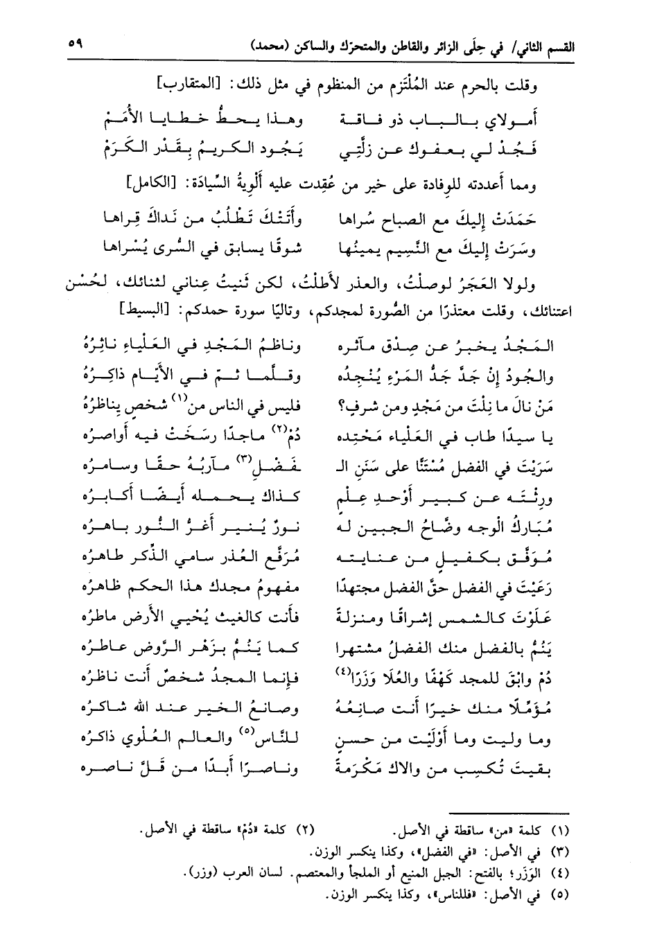 ولولا العجر لوصلت، والعذر لأطلت، لكن ثنيت عناني لثنائك، لحسن اعتنائك، وقلت معتذرا من الصّورة لمجدكم، وتاليا سورة حمدكم: [البسيط]