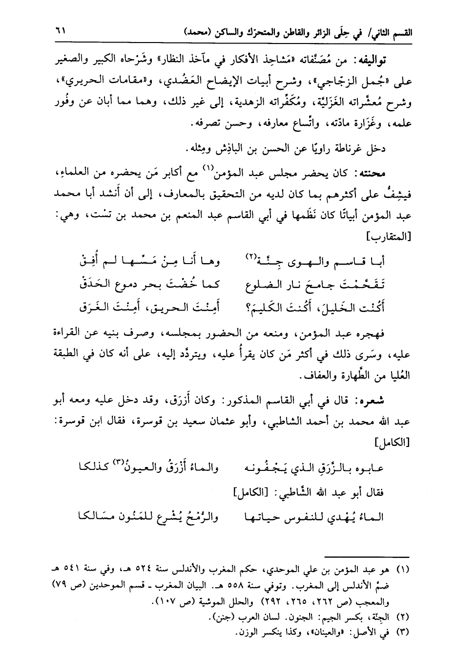 محنته: كان يحضر مجلس عبد المؤمن «1» مع أكابر من يحضره من العلماء، فيشفّ على أكثرهم بما كان لديه من التحقيق بالمعارف، إلى أن أنشد أبا محمد عبد المؤمن أبياتا كان نظمها في أبي القاسم عبد المنعم بن محمد بن تست، وهي: