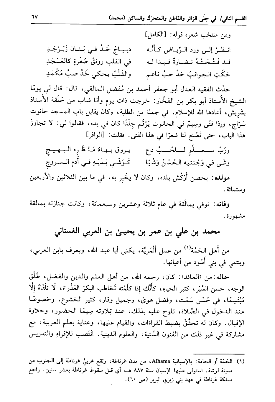 من أهل الحمّة «1» من عمل المريّة، يكنى أبا عبد الله، ويعرف بابن العربي، وينتمي في بني أسود من أعيانها.
