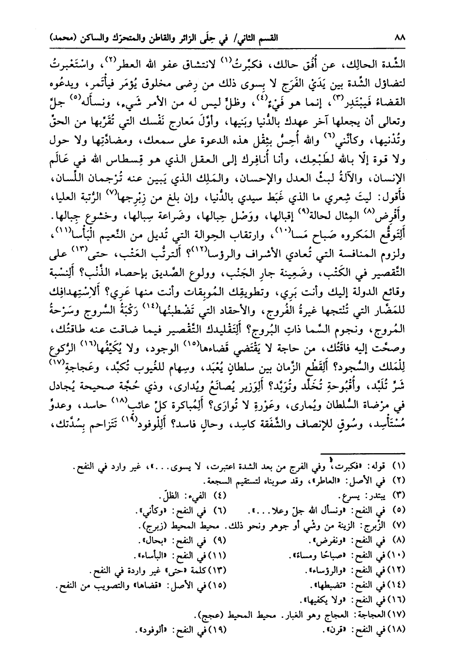 التوقّع المكروه صباح مسا «10» ، وارتقاب الحوالة التي تديل من النّعيم البأساء «11» ، ولزوم المنافسة التي تعادي الأشراف والرؤسا «12» ؟ ألترتّب العتب، حتى «13» على التّقصير في الكتب، وضعينة جار الجنب، وولوع الصّديق بإحصاء الذّنب؟ ألنسبة وقائع الدولة إليك وأنت بري، وتطويقك الموبقات وأنت منها عري؟ ألاستهدافك للمضّار التي تنتجها غيرة الفروج، والأحقاد التي تضطبنها «14» ركبة السّروج وسرحة المروج، ونجوم السّما ذات البروج؟ ألتقليدك التّقصير فيما ضاقت عنه طاقتك، وصحّت إليه فاقتك، من حاجة لا يقتضي قضاءها «15» الوجود، ولا يكيّفها «16» الرّكوع للملك والسّجود؟ ألقطع الزّمان بين سلطان يعبد، وسهام للغيوب تكبّد، وعجاجة «17» شرّ تلبّد، وأقبوحة تخلّد وتوبّد؟ ألوزير يصانع ويدارى، وذي حجّة صحيحة يجادل في مرضاة السّلطان ويمارى، وعورة لا توارى؟ ألمباكرة كلّ عائب «18» حاسد، وعدوّ مستأسد، وسوق للإنصاف والشّفقة كاسد، وحال فاسد؟ أللوفود «19» تتزاحم بسدّتك،