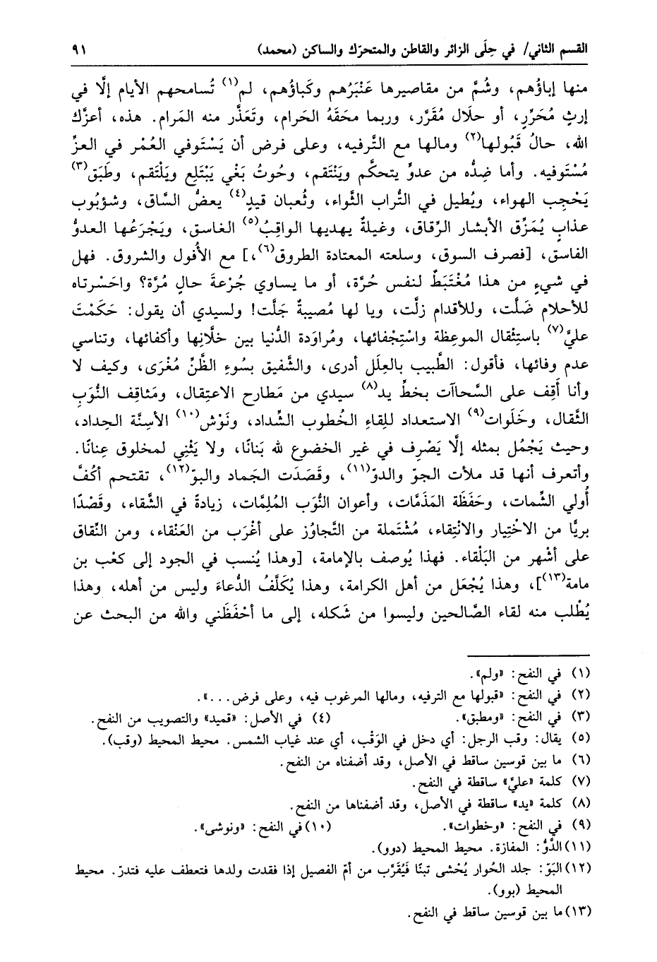 وأتعرف أنها قد ملأت الجوّ والدوّ «11» ، وقصدت الجماد والبوّ «12» ، تقتحم أكفّ أولي الشّمات، وحفظة المذمّات، وأعوان النّوب الملمّات، زيادة في الشّقاء، وقصدا بريّا من الاختيار والانتقاء، مشتملة من التّجاوز على أغرب من العنقاء، ومن النّقاق على أشهر من البلقاء. فهذا يوصف بالإمامة، [وهذا ينسب في الجود إلى كعب بن مامة «13» ] ، وهذا يجعل من أهل الكرامة، وهذا يكلّف الدّعاء وليس من أهله، وهذا يطلب منه لقاء الصّالحين وليسوا من شكله، إلى ما أحفظني والله من البحث عن
