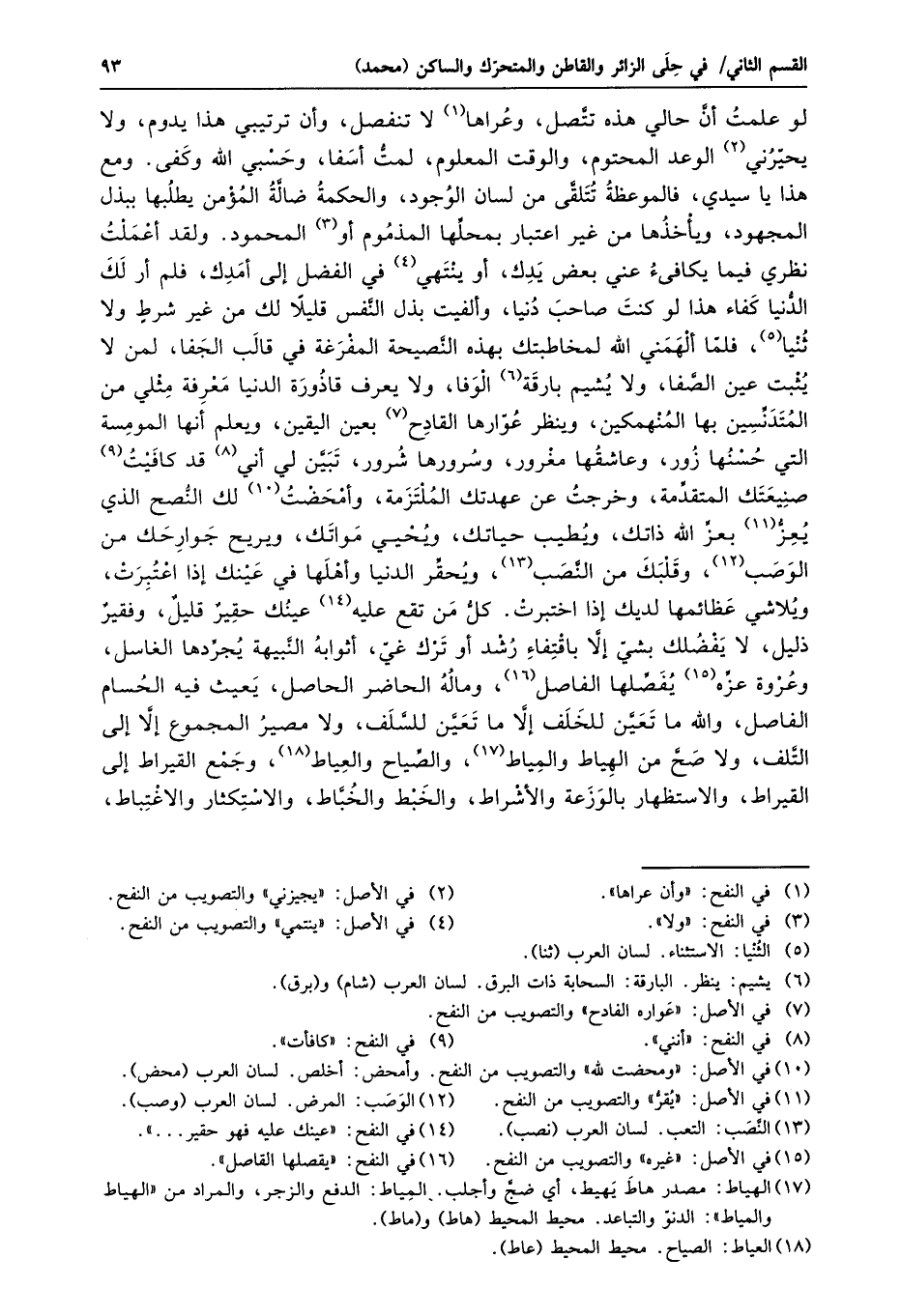 لو علمت أنّ حالي هذه تتّصل، وعراها «1» لا تنفصل، وأن ترتيبي هذا يدوم، ولا يحيّرني «2» الوعد المحتوم، والوقت المعلوم، لمتّ أسفا، وحسبي الله وكفى. ومع هذا يا سيدي، فالموعظة تتلقّى من لسان الوجود، والحكمة ضالّة المؤمن يطلبها ببذل المجهود، ويأخذها من غير اعتبار بمحلّها المذموم أو «3» المحمود. ولقد أعملت نظري فيما يكافىء عني بعض يدك، أو ينتهي «4» في الفضل إلى أمدك، فلم أر لك الدّنيا كفاء هذا لو كنت صاحب دنيا، وألفيت بذل النّفس قليلا لك من غير شرط ولا ثنيا «5» ، فلمّا ألهمني الله لمخاطبتك بهذه النّصيحة المفرغة في قالب الجفا، لمن لا يثبت عين الصّفا، ولا يشيم بارقة «6» الوفا، ولا يعرف قاذورة الدنيا معرفة مثلي من المتدنّسين بها المنهمكين، وينظر عوّارها القادح «7» بعين اليقين، ويعلم أنها المومسة التي حسنها زور، وعاشقها مغرور، وسرورها شرور، تبيّن لي أني «8» قد كافيت «9» صنيعتك المتقدّمة، وخرجت عن عهدتك الملتزمة، وأمحضت «10» لك النّصح الذي يعزّ «11» بعزّ الله ذاتك، ويطيب حياتك، ويحيي مواتك، ويريح جوارحك من الوصب «12» ، وقلبك من النّصب «13» ، ويحقّر الدنيا وأهلها في عينك إذا اعتبرت، ويلاشي عظائمها لديك إذا اختبرت. كلّ من تقع عليه «14» عينك حقير قليل، وفقير ذليل، لا يفضلك بشيّ إلّا باقتفاء رشد أو ترك غيّ، أثوابه النّبيهة يجرّدها الغاسل، وعروة عزّه «15» يفصّلها الفاصل «16» ، وماله الحاضر الحاصل، يعيث فيه الحسام الفاصل، والله ما تعيّن للخلف إلّا ما تعيّن للسّلف، ولا مصير المجموع إلّا إلى التّلف، ولا صحّ من الهياط والمياط «17» ، والصّياح والعياط «18» ، وجمع القيراط إلى القيراط، والاستظهار بالوزعة والأشراط، والخبط والخبّاط، والاستكثار والاغتباط،