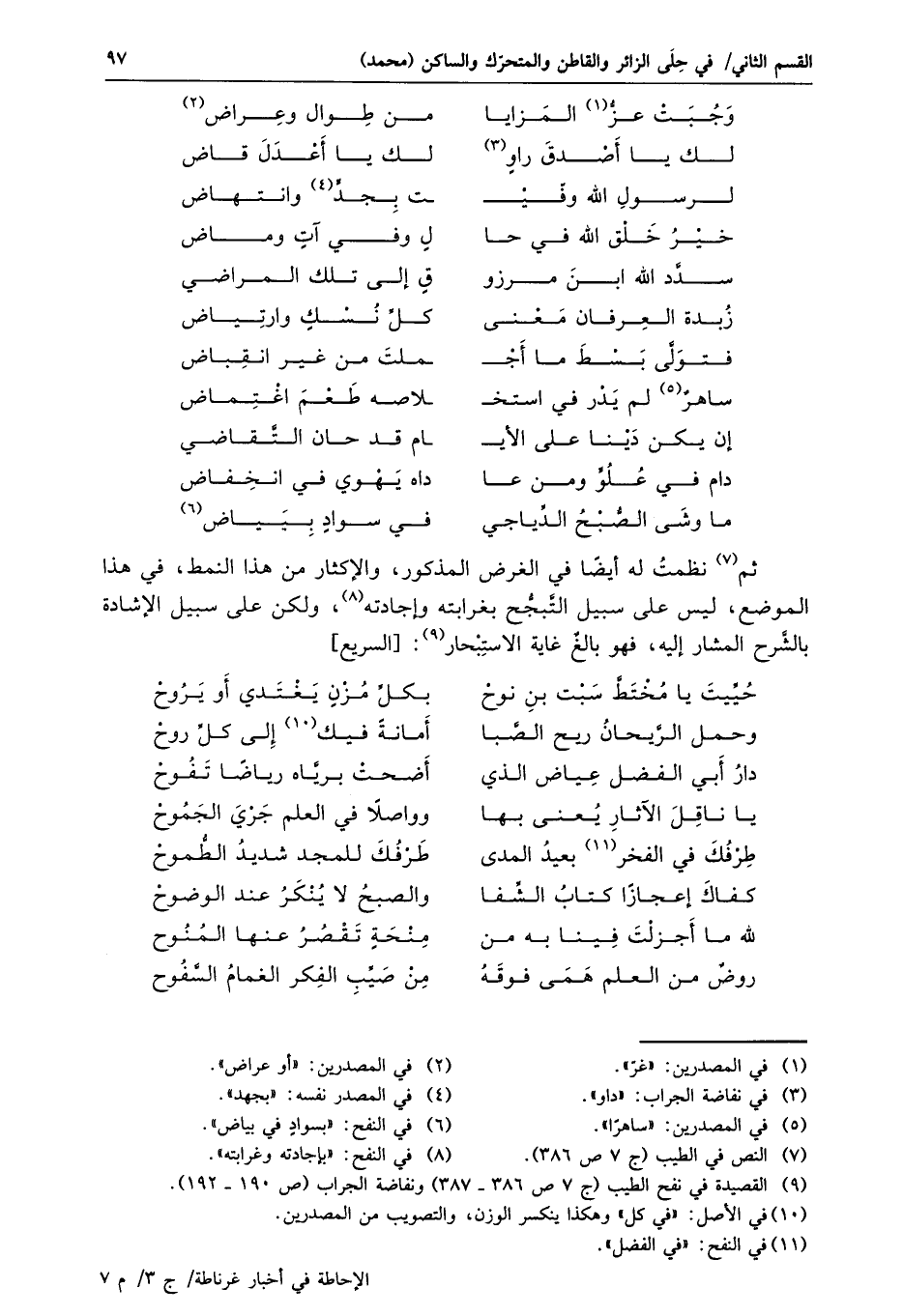 ثم «7» نظمت له أيضا في الغرض المذكور، والإكثار من هذا النمط، في هذا الموضع، ليس على سبيل التّبجّح بغرابته وإجادته «8» ، ولكن على سبيل الإشادة بالشّرح المشار إليه، فهو بالغ غاية الاستبحار «9» : [السريع]