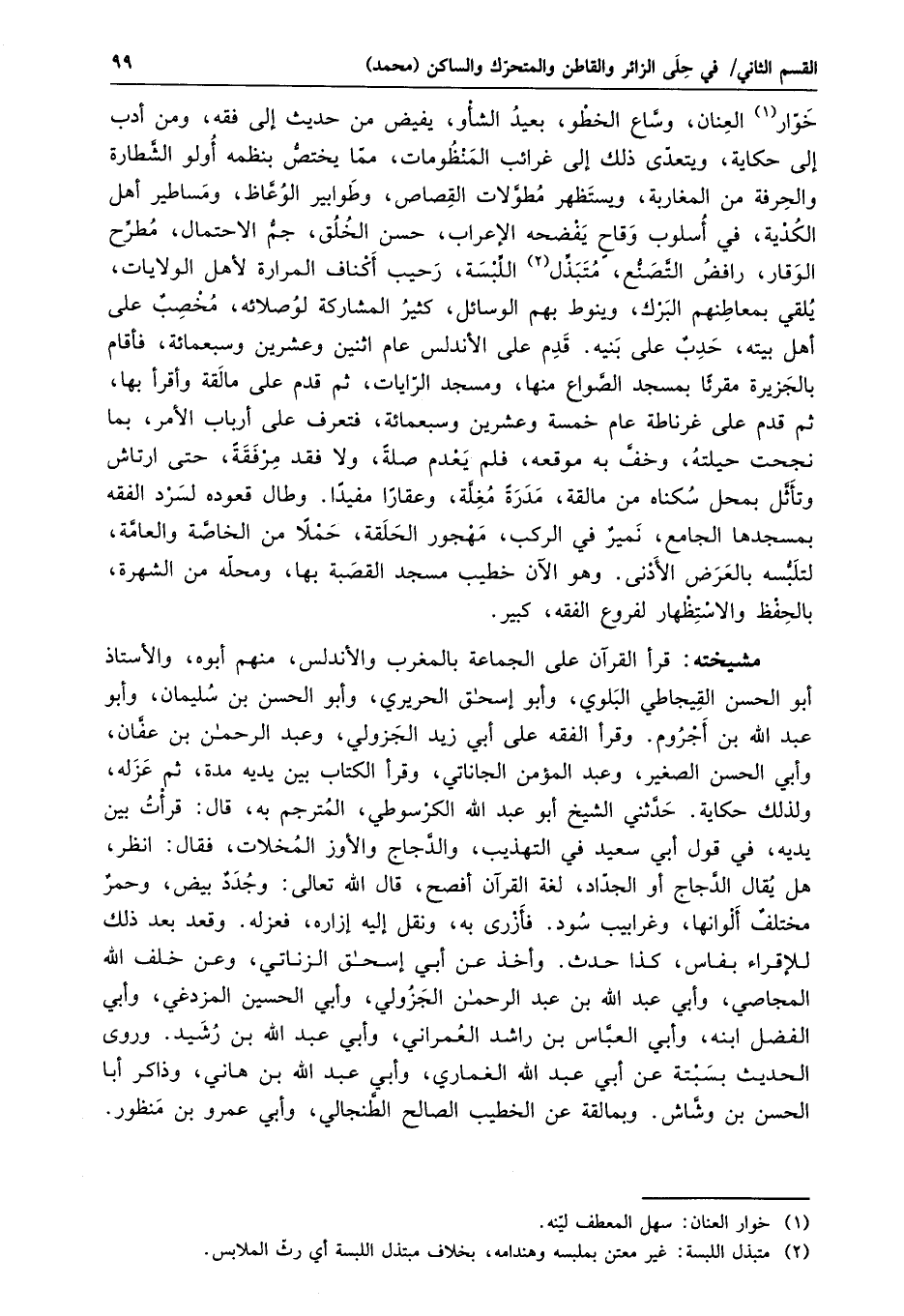 خوّار «1» العنان، وسّاع الخطو، بعيد الشأو، يفيض من حديث إلى فقه، ومن أدب إلى حكاية، ويتعدّى ذلك إلى غرائب المنظومات، ممّا يختصّ بنظمه أولو الشّطارة والحرفة من المغاربة، ويستظهر مطوّلات القصاص، وطوابير الوعّاظ، ومساطير أهل الكدية، في أسلوب وقاح يفضحه الإعراب، حسن الخلق، جمّ الاحتمال، مطرّح الوقار، رافض التّصنّع، متبذّل «2» اللّبسة، رحيب أكناف المرارة لأهل الولايات، يلقي بمعاطنهم البرك، وينوط بهم الوسائل، كثير المشاركة لوصلائه، مخصب على أهل بيته، حدب على بنيه. قدم على الأندلس عام اثنين وعشرين وسبعمائة، فأقام بالجزيرة مقرئا بمسجد الصّواع منها، ومسجد الرّايات، ثم قدم على مالقة وأقرأ بها، ثم قدم على غرناطة عام خمسة وعشرين وسبعمائة، فتعرف على أرباب الأمر، بما نجحت حيلته، وخفّ به موقعه، فلم يعدم صلة، ولا فقد مرفقة، حتى ارتاش وتأثّل بمحل سكناه من مالقة، مدرة مغلّة، وعقارا مفيدا. وطال قعوده لسرد الفقه بمسجدها الجامع، نمير في الركب، مهجور الحلقة، حملا من الخاصّة والعامّة، لتلبّسه بالعرض الأدني. وهو الآن خطيب مسجد القصبة بها، ومحلّه من الشهرة، بالحفظ والاستظهار لفروع الفقه، كبير.