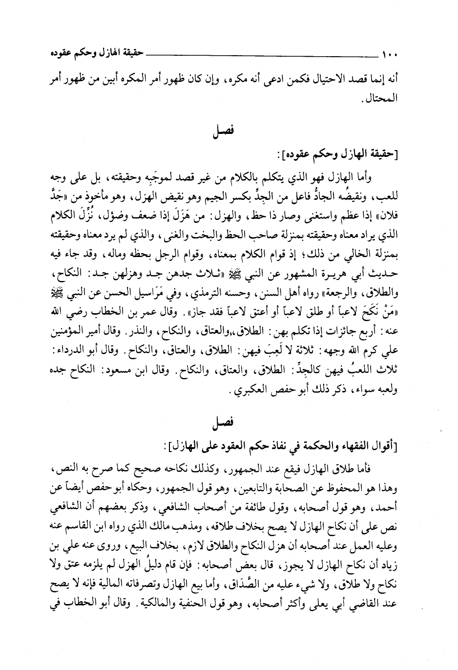 فَأَمَّا طَلَاقُ الْهَازِلِ فَيَقَعُ عِنْدَ الْجُمْهُورِ، وَكَذَلِكَ نِكَاحُهُ صَحِيحٌ كَمَا صَرَّحَ بِهِ النَّصُّ، وَهَذَا هُوَ الْمَحْفُوظُ عَنْ الصَّحَابَةِ وَالتَّابِعِينَ، وَهُوَ قَوْلُ الْجُمْهُورِ، وَحَكَاهُ أَبُو حَفْصٍ أَيْضًا عَنْ أَحْمَدَ، وَهُوَ قَوْلُ أَصْحَابِهِ، وَقَوْلُ طَائِفَةٍ مِنْ أَصْحَابِ الشَّافِعِيِّ، وَذَكَرَ بَعْضُهُمْ أَنَّ الشَّافِعِيَّ نَصَّ عَلَى أَنَّ نِكَاحَ الْهَازِلِ لَا يَصِحُّ بِخِلَافِ طَلَاقِهِ، وَمَذْهَبُ مَالِكٍ الَّذِي رَوَاهُ ابْنُ الْقَاسِمِ عَنْهُ وَعَلَيْهِ الْعَمَلُ عِنْدَ أَصْحَابِهِ أَنَّ هَزْلَ النِّكَاحِ وَالطَّلَاقِ لَازِمٌ، بِخِلَافِ الْبَيْعِ، وَرَوَى عَنْهُ عَلِيُّ بْنُ زِيَادٍ أَنَّ نِكَاحَ الْهَازِلِ لَا يَجُوزُ.