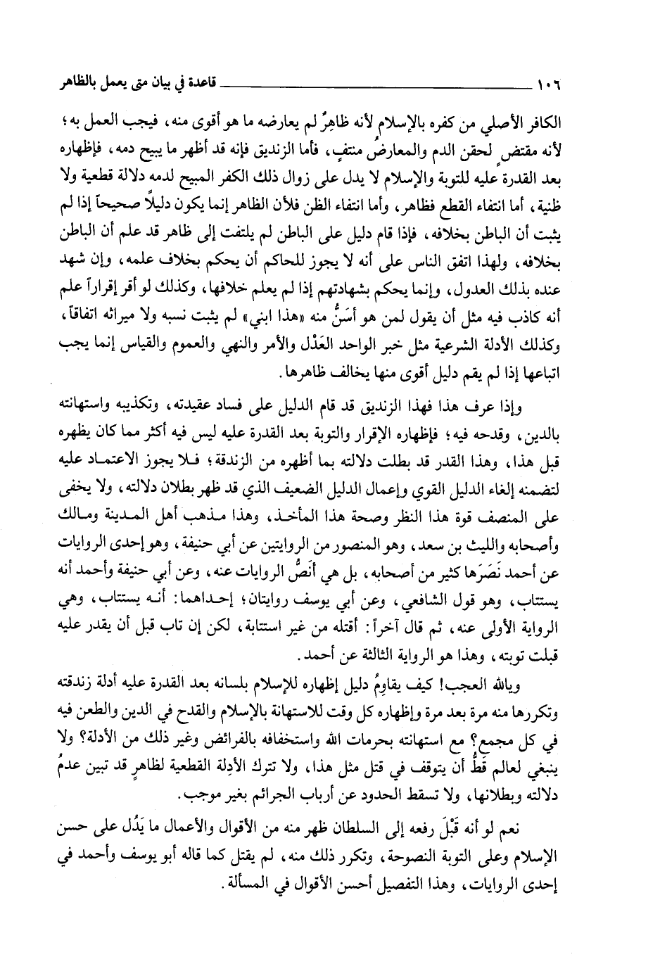 وَإِذَا عُرِفَ هَذَا فَهَذَا الزِّنْدِيقُ قَدْ قَامَ الدَّلِيلُ عَلَى فَسَادِ عَقِيدَتِهِ، وَتَكْذِيبِهِ وَاسْتِهَانَتِهِ بِالدِّينِ، وَقَدْحِهِ فِيهِ؛ فَإِظْهَارُهُ الْإِقْرَارَ وَالتَّوْبَةَ بَعْدَ الْقُدْرَةِ عَلَيْهِ لَيْسَ فِيهِ أَكْثَرُ مِمَّا كَانَ يُظْهِرُهُ قَبْلَ هَذَا، وَهَذَا الْقَدْرُ قَدْ بَطَلَتْ دَلَالَتُهُ بِمَا أَظْهَرَهُ مِنْ الزَّنْدَقَةِ؛ فَلَا يَجُوزُ الِاعْتِمَادُ عَلَيْهِ لِتَضَمُّنِهِ إلْغَاءَ الدَّلِيلِ الْقَوِيِّ وَإِعْمَالَ الدَّلِيلِ الضَّعِيفِ الَّذِي قَدْ ظَهَرَ بُطْلَانُ دَلَالَتِهِ، وَلَا يَخْفَى عَلَى الْمُنْصِفِ قُوَّةُ هَذَا النَّظَرِ وَصِحَّةُ هَذَا الْمَأْخَذِ، وَهَذَا مَذْهَبُ أَهْلِ الْمَدِينَةِ وَمَالِكٍ وَأَصْحَابِهِ وَاللَّيْثِ بْنِ سَعْدٍ، وَهُوَ الْمَنْصُورُ مِنْ الرِّوَايَتَيْنِ عَنْ أَبِي حَنِيفَةَ، وَهُوَ إحْدَى الرِّوَايَاتِ عَنْ أَحْمَدَ نَصَرَهَا كَثِيرٌ مِنْ أَصْحَابِهِ، بَلْ هِيَ أَنَصُّ الرِّوَايَاتِ عَنْهُ، وَعَنْ أَبِي حَنِيفَةَ وَأَحْمَدَ أَنَّهُ يُسْتَتَابُ، وَهُوَ قَوْلُ الشَّافِعِيِّ، وَعَنْ أَبِي يُوسُفَ رِوَايَتَانِ؛ إحْدَاهُمَا: أَنَّهُ يُسْتَتَابُ، وَهِيَ الرِّوَايَةُ الْأُولَى عَنْهُ، ثُمَّ قَالَ آخِرًا: أَقْتُلُهُ مِنْ غَيْرِ اسْتِتَابَةٍ، لَكِنْ إنْ تَابَ قَبْلَ أَنْ يُقْدَرَ عَلَيْهِ قُبِلَتْ تَوْبَتُهُ، وَهَذَا هُوَ الرِّوَايَةُ الثَّالِثَةُ عَنْ أَحْمَدَ