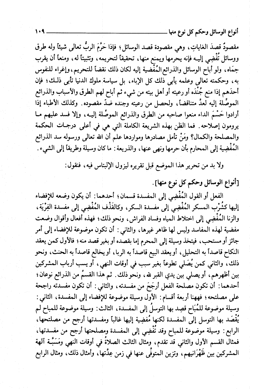 مَقْصُودٌ قَصْدَ الْغَايَاتِ، وَهِيَ مَقْصُودَةٌ قَصْدَ الْوَسَائِلِ؛ فَإِذَا حَرَّمَ الرَّبُّ تَعَالَى شَيْئًا وَلَهُ طُرُقٌ وَوَسَائِلُ تُفْضِي إلَيْهِ فَإِنَّهُ يُحَرِّمُهَا وَيَمْنَعُ مِنْهَا، تَحْقِيقًا لِتَحْرِيمِهِ، وَتَثْبِيتًا لَهُ، وَمَنْعًا أَنْ يُقْرَبَ حِمَاهُ، وَلَوْ أَبَاحَ الْوَسَائِلَ وَالذَّرَائِعَ الْمُفْضِيَةَ إلَيْهِ لَكَانَ ذَلِكَ نَقْضًا لِلتَّحْرِيمِ، وَإِغْرَاءً لِلنُّفُوسِ بِهِ، وَحِكْمَتُهُ تَعَالَى وَعِلْمُهُ يَأْبَى ذَلِكَ كُلَّ الْإِبَاءِ، بَلْ سِيَاسَةُ مُلُوكِ الدُّنْيَا تَأْبَى ذَلِكَ؛ فَإِنَّ أَحَدَهُمْ إذَا مَنَعَ جُنْدَهُ أَوْ رَعِيَّتَهُ أَوْ أَهْلَ بَيْتِهِ مِنْ شَيْءٍ ثُمَّ أَبَاحَ لَهُمْ الطُّرُقَ وَالْأَسْبَابَ وَالذَّرَائِعَ الْمُوَصِّلَةَ إلَيْهِ لَعُدَّ مُتَنَاقِضًا، وَلَحَصَلَ مِنْ رَعِيَّتِهِ وَجُنْدِهِ ضِدُّ مَقْصُودِهِ. وَكَذَلِكَ الْأَطِبَّاءُ إذَا أَرَادُوا حَسْمَ الدَّاءِ مَنَعُوا صَاحِبَهُ مِنْ الطُّرُقِ وَالذَّرَائِعِ الْمُوَصِّلَةِ إلَيْهِ، وَإِلَّا فَسَدَ عَلَيْهِمْ مَا يَرُومُونَ إصْلَاحَهُ. فَمَا الظَّنُّ بِهَذِهِ الشَّرِيعَةِ الْكَامِلَةِ الَّتِي هِيَ فِي أَعْلَى دَرَجَاتِ الْحِكْمَةِ وَالْمَصْلَحَةِ وَالْكَمَالِ؟ وَمَنْ تَأَمَّلَ مَصَادِرَهَا وَمَوَارِدَهَا عَلِمَ أَنَّ اللَّهَ تَعَالَى وَرَسُولَهُ سَدَّ الذَّرَائِعَ الْمُفْضِيَةَ إلَى الْمَحَارِمِ بِأَنْ حَرَّمَهَا وَنَهَى عَنْهَا، وَالذَّرِيعَةُ: مَا كَانَ وَسِيلَةً وَطَرِيقًا إلَى الشَّيْءِ