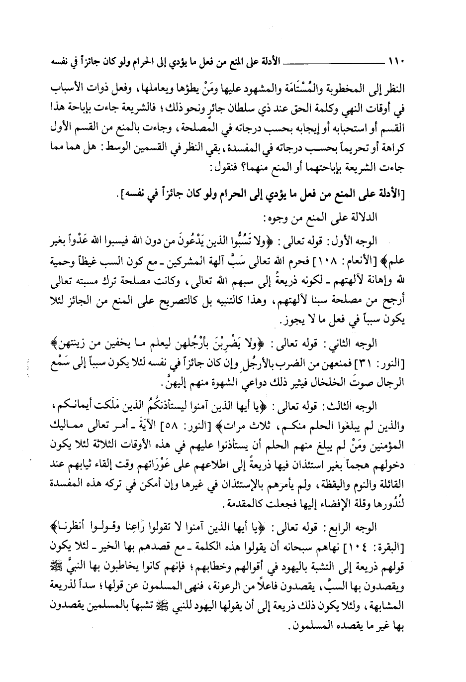 الدَّلَالَةُ عَلَى الْمَنْعِ مِنْ وُجُوهٍ: الْوَجْهُ الْأَوَّلُ: قَوْله تَعَالَى: {وَلا تَسُبُّوا الَّذِينَ يَدْعُونَ مِنْ دُونِ اللَّهِ فَيَسُبُّوا اللَّهَ عَدْوًا بِغَيْرِ عِلْمٍ} [الأنعام: 108] فَحَرَّمَ اللَّهُ تَعَالَى سَبَّ آلِهَةِ الْمُشْرِكِينَ - مَعَ كَوْنِ السَّبِّ غَيْظًا وَحَمِيَّةً لِلَّهِ وَإِهَانَةً لِآلِهَتِهِمْ - لِكَوْنِهِ ذَرِيعَةً إلَى سَبِّهِمْ اللَّهَ تَعَالَى، وَكَانَتْ مَصْلَحَةُ تَرْكِ مَسَبَّتِهِ تَعَالَى أَرْجَحَ مِنْ مَصْلَحَةِ سَبِّنَا لِآلِهَتِهِمْ، وَهَذَا كَالتَّنْبِيهِ بَلْ كَالتَّصْرِيحِ عَلَى الْمَنْعِ مِنْ الْجَائِزِ لِئَلَّا يَكُونَ سَبَبًا فِي فِعْلِ مَا لَا يَجُوزُ.