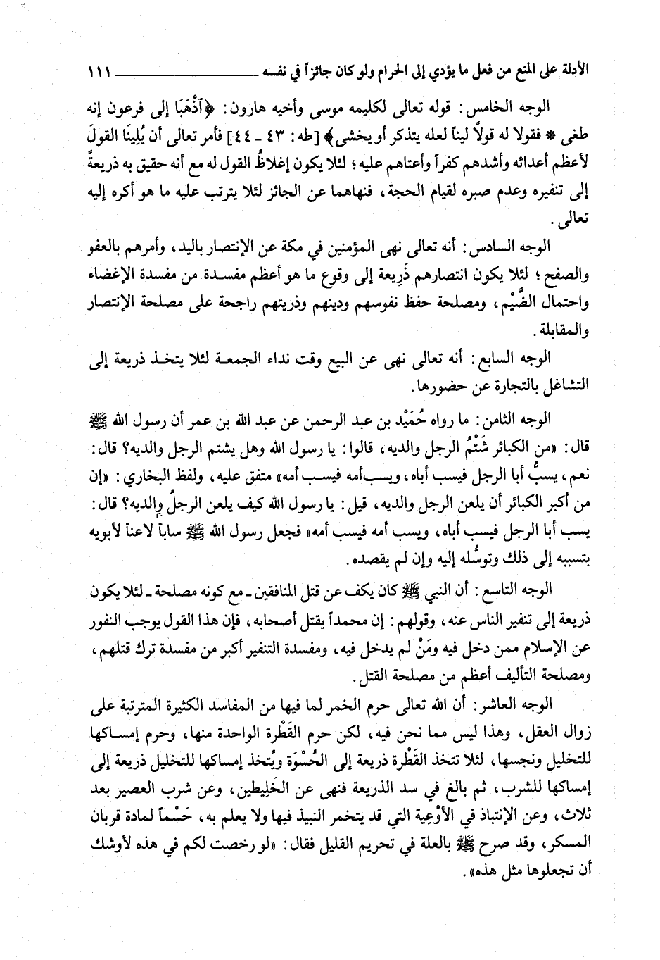 الْوَجْه السَّادِسُ: أَنَّهُ تَعَالَى نَهَى الْمُؤْمِنِينَ فِي مَكَّةَ عَنْ الِانْتِصَارِ بِالْيَدِ، وَأَمَرَهُمْ بِالْعَفْوِ وَالصَّفْحِ؛ لِئَلَّا يَكُونَ انْتِصَارُهُمْ ذَرِيعَةً إلَى وُقُوعِ مَا هُوَ أَعْظَمُ مَفْسَدَةً مِنْ مَفْسَدَةِ الْإِغْضَاءِ وَاحْتِمَالِ الضَّيْمِ، وَمَصْلَحَةُ حِفْظِ نُفُوسِهِمْ وَدِينِهِمْ وَذُرِّيَّتِهِمْ رَاجِحَةٌ عَلَى مَصْلَحَةِ الِانْتِصَارِ وَالْمُقَابَلَةِ.
