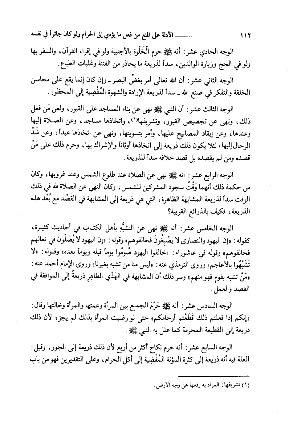 الْوَجْهُ الثَّالِثَ عَشَرَ: أَنَّ النَّبِيَّ - صَلَّى اللَّهُ عَلَيْهِ وَسَلَّمَ - نَهَى عَنْ بِنَاءِ الْمَسَاجِدِ عَلَى الْقُبُورِ، وَلَعَنَ مَنْ فَعَلَ ذَلِكَ، وَنَهَى عَنْ تَجْصِيص الْقُبُورِ، وَتَشْرِيفِهَا، وَاِتِّخَاذِهَا مَسَاجِدَ، وَعَنْ الصَّلَاةِ إلَيْهَا وَعِنْدَهَا، وَعَنْ إيقَادِ الْمَصَابِيحِ عَلَيْهَا، وَأَمَرَ بِتَسْوِيَتِهَا، وَنَهَى عَنْ اتِّخَاذِهَا عِيدًا، وَعَنْ شَدِّ الرِّحَالِ إلَيْهَا، لِئَلَّا يَكُونَ ذَلِكَ ذَرِيعَةً إلَى اتِّخَاذِهَا أَوْثَانًا وَالْإِشْرَاكِ بِهَا، وَحَرَّمَ ذَلِكَ عَلَى مَنْ قَصَدَهُ وَمَنْ لَمْ يَقْصِدْهُ بَلْ قَصَدَ خِلَافَهُ سَدًّا لِلذَّرِيعَةِ.