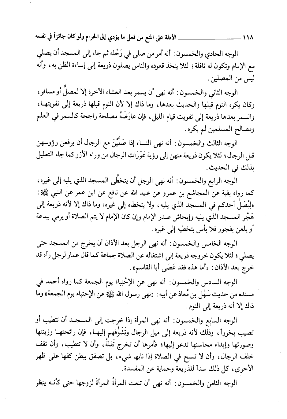 الْوَجْهُ الرَّابِعُ وَالْخَمْسُونَ: أَنَّهُ نَهَى الرَّجُلَ أَنْ يَتَخَطَّى الْمَسْجِدَ الَّذِي يَلِيه إلَى غَيْرِهِ، كَمَا رَوَاهُ بَقِيَّةُ عَنْ الْمُجَاشِعِ بْنِ عَمْرٍو عَنْ عُبَيْدِ اللَّهِ عَنْ نَافِعٍ عَنْ ابْنِ عُمَرَ عَنْ النَّبِيِّ - صَلَّى اللَّهُ عَلَيْهِ وَسَلَّمَ -: «لِيُصَلِّ أَحَدُكُمْ فِي الْمَسْجِدِ الَّذِي يَلِيه، وَلَا يَتَخَطَّاهُ إلَى غَيْرِهِ» وَمَا ذَاكَ إلَّا لِأَنَّهُ ذَرِيعَةٌ إلَى هَجْرِ الْمَسْجِدِ الَّذِي يَلِيه وَإِيحَاشِ صَدْرِ الْإِمَامِ وَإِنْ كَانَ الْإِمَامُ لَا يُتِمُّ الصَّلَاةَ أَوْ يُرْمَى بِبِدْعَةٍ أَوْ يَلْعَنُ بِفُجُورٍ فَلَا بَأْسَ بِتَخَطِّيهِ إلَى غَيْرِهِ.