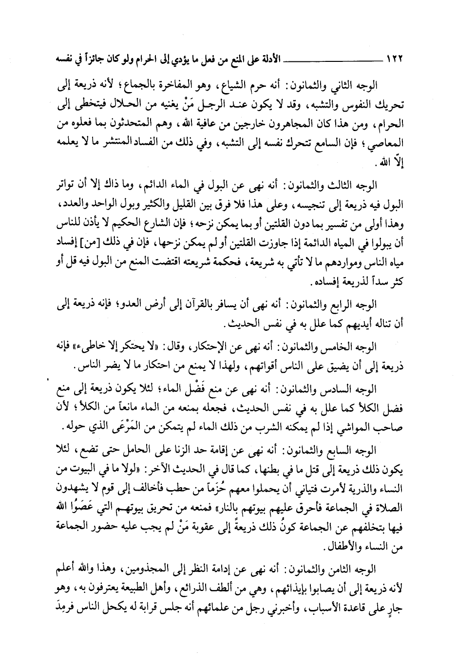 الْوَجْهُ الثَّالِثُ وَالثَّمَانُونَ: أَنَّهُ نَهَى عَنْ الْبَوْلِ فِي الْمَاءِ الدَّائِمِ، وَمَا ذَاكَ إلَّا أَنَّ تَوَاتُرَ الْبَوْلِ فِيهِ ذَرِيعَةٌ إلَى تَنْجِيسِهِ، وَعَلَى هَذَا فَلَا فَرْقَ بَيْنَ الْقَلِيلِ وَالْكَثِيرِ وَبَوْلِ الْوَاحِدِ وَالْعَدَدِ، وَهَذَا أَوْلَى مِنْ تَفْسِيرِ بِمَا دُونَ الْقُلَّتَيْنِ أَوْ بِمَا يُمْكِنُ نَزْحُهُ؛ فَإِنَّ الشَّارِعَ الْحَكِيمَ لَا يَأْذَنُ لِلنَّاسِ أَنْ يَبُولُوا فِي الْمِيَاهِ الدَّائِمَةِ إذَا جَاوَزَتْ الْقُلَّتَيْنِ أَوْ لَمْ يُمْكِنْ نَزْحُهَا، فَإِنَّ فِي ذَلِكَ [مِنْ] إفْسَادِ مِيَاهِ النَّاسِ وَمَوَارِدِهِمْ مَا لَا تَأْتِي بِهِ شَرِيعَةٌ، فَحِكْمَةُ شَرِيعَتِهِ اقْتَضَتْ الْمَنْعَ مِنْ الْبَوْلِ فِيهِ قَلَّ أَوْ كَثُرَ سَدًّا لِذَرِيعَةِ إفْسَادِهِ.