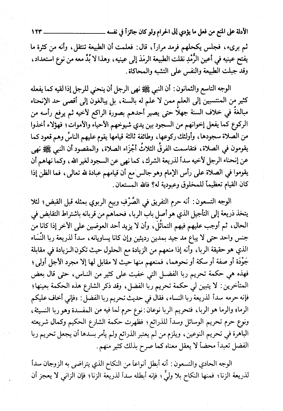 الْوَجْهُ التِّسْعُونَ: أَنَّهُ حَرَّمَ التَّفْرِيقَ فِي الصَّرْفِ وَبَيْعِ الرِّبَوِيِّ بِمِثْلِهِ قَبْلَ الْقَبْضِ؛ لِئَلَّا يُتَّخَذَ ذَرِيعَةً إلَى التَّأْجِيلِ الَّذِي هُوَ أَصْلُ بَابِ الرِّبَا، فَحَمَاهُمْ مِنْ قُرْبَانِهِ بِاشْتِرَاطِ التَّقَابُضِ فِي الْحَالِ، ثُمَّ أَوْجَبَ عَلَيْهِمْ فِيهِمْ التَّمَاثُلَ، وَأَنْ لَا يَزِيدَ أَحَدُ الْعِوَضَيْنِ عَلَى الْآخَرِ إذَا كَانَا مِنْ جِنْسٍ وَاحِدٍ حَتَّى لَا يُبَاعَ مُدٌّ جَيِّدٌ بِمُدَّيْنِ رَدِيئَيْنِ وَإِنْ كَانَا يُسَاوِيَانِهِ، سَدًّا لِذَرِيعَةِ رِبَا النَّسَاءِ الَّذِي هُوَ حَقِيقَةُ الرِّبَا، وَأَنَّهُ إذَا مَنَعَهُمْ مِنْ الزِّيَادَةِ مَعَ الْحُلُولِ حَيْثُ تَكُونُ الزِّيَادَةُ فِي مُقَابَلَةِ جَوْدَةٍ أَوْ صِفَةٍ أَوْ سِكَّةٍ أَوْ نَحْوِهِمَا، فَمَنْعُهُمْ مِنْهَا حَيْثُ لَا مُقَابِلَ لَهَا إلَّا مُجَرَّدُ الْأَجَلِ أَوْلَى؛ فَهَذِهِ هِيَ حِكْمَةُ تَحْرِيمِ رِبَا الْفَضْلِ الَّتِي خَفِيَتْ عَلَى كَثِيرٍ مِنْ النَّاسِ، حَتَّى قَالَ بَعْضُ الْمُتَأَخِّرِينَ: لَا يَتَبَيَّنُ لِي حِكْمَةُ تَحْرِيمِ رِبَا الْفَضْلِ، وَقَدْ ذَكَرَ الشَّارِعُ هَذِهِ الْحِكْمَةَ بِعَيْنِهَا؛ فَإِنَّهُ حَرَّمَهُ سَدًّا لِذَرِيعَةِ رِبَا النَّسَاءِ، فَقَالَ فِي حَدِيثِ تَحْرِيمِ رِبَا الْفَضْلِ: «فَإِنِّي أَخَافُ عَلَيْكُمْ الرِّمَا» وَالرِّمَا هُوَ الرِّبَا، فَتَحْرِيمُ الرِّبَا نَوْعَانِ: نَوْعٌ حُرِّمَ لِمَا فِيهِ مِنْ الْمَفْسَدَةِ وَهُوَ رِبَا النَّسِيئَةِ، وَنَوْعٌ حُرِّمَ تَحْرِيمَ الْوَسَائِلِ وَسَدًّا لِلذَّرَائِعِ؛ فَظَهَرَتْ حِكْمَةُ الشَّارِعِ الْحَكِيمِ وَكَمَالُ شَرِيعَتِهِ الْبَاهِرَةِ فِي تَحْرِيمِ النَّوْعَيْنِ، وَيَلْزَمُ مَنْ لَمْ يَعْتَبِرْ الذَّرَائِعَ وَلَمْ يَأْمُرْ بِسَدِّهَا أَنْ يُجْعَلَ تَحْرِيمُ رِبَا الْفَضْلِ تَعَبُّدًا مَحْضًا لَا يُعْقَلُ مَعْنَاهُ كَمَا صَرَّحَ بِذَلِكَ كَثِيرٌ مِنْهُمْ.