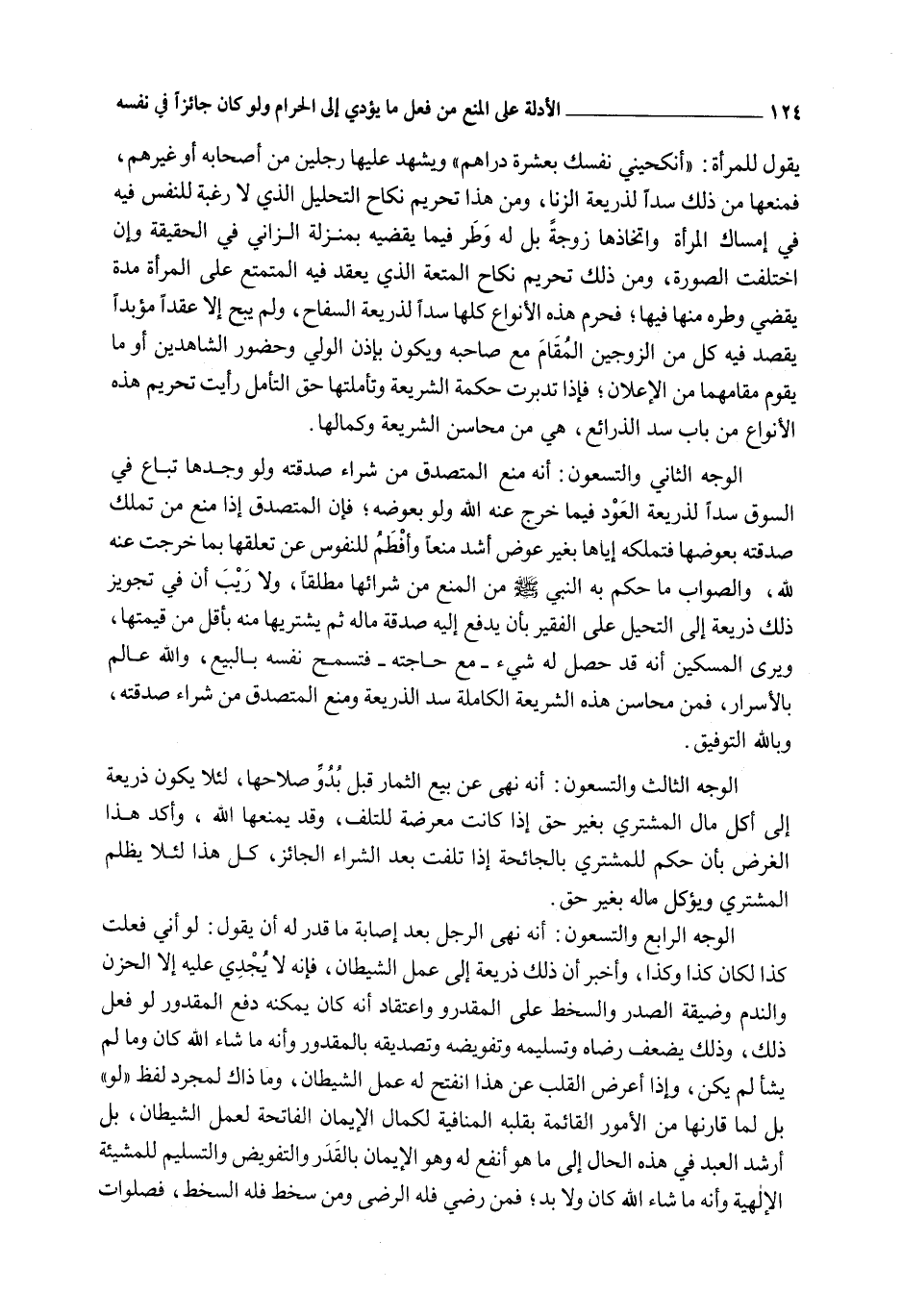 يَقُولُ لِلْمَرْأَةِ: " أَنْكِحِينِي نَفْسَك بِعَشَرَةِ دَرَاهِمَ " وَيُشْهِدُ عَلَيْهَا رَجُلَيْنِ مِنْ أَصْحَابِهِ أَوْ غَيْرِهِمْ، فَمَنْعُهَا مِنْ ذَلِكَ سَدًّا لِذَرِيعَةِ الزِّنَا، وَمِنْ هَذَا تَحْرِيمُ نِكَاحِ التَّحْلِيلِ الَّذِي لَا رَغْبَةَ لِلنَّفْسِ فِيهِ فِي إمْسَاكِ الْمَرْأَةِ وَاِتِّخَاذِهَا زَوْجَةً بَلْ لَهُ وَطَرٌ فِيمَا يَقْضِيه بِمَنْزِلَةِ الزَّانِي فِي الْحَقِيقَةِ وَإِنْ اخْتَلَفَتْ الصُّورَةُ، وَمِنْ ذَلِكَ تَحْرِيمُ نِكَاحِ الْمُتْعَةِ الَّذِي يَعْقِدُ فِيهِ الْمُتَمَتِّعُ عَلَى الْمَرْأَةِ مُدَّةً يَقْضِي وَطَرَهُ مِنْهَا فِيهَا؛ فَحَرَّمَ هَذِهِ الْأَنْوَاعَ كُلَّهَا سَدًّا لِذَرِيعَةِ السِّفَاحِ، وَلَمْ يُبِحْ إلَّا عَقْدًا مُؤَبَّدًا يَقْصِدُ فِيهِ كُلٌّ مِنْ الزَّوْجَيْنِ الْمَقَامَ مَعَ صَاحِبِهِ وَيَكُونُ بِإِذْنِ الْوَلِيِّ وَحُضُورِ الشَّاهِدَيْنِ أَوْ مَا يَقُومُ مَقَامَهُمَا مِنْ الْإِعْلَانِ؛ فَإِذَا تَدَبَّرْت حِكْمَةَ الشَّرِيعَةِ وَتَأَمَّلْتهَا حَقَّ التَّأَمُّلِ رَأَيْت تَحْرِيمَ هَذِهِ الْأَنْوَاعِ مِنْ بَابِ سَدِّ الذَّرَائِعِ، هِيَ مِنْ مَحَاسِنِ الشَّرِيعَةِ وَكَمَالِهَا.
