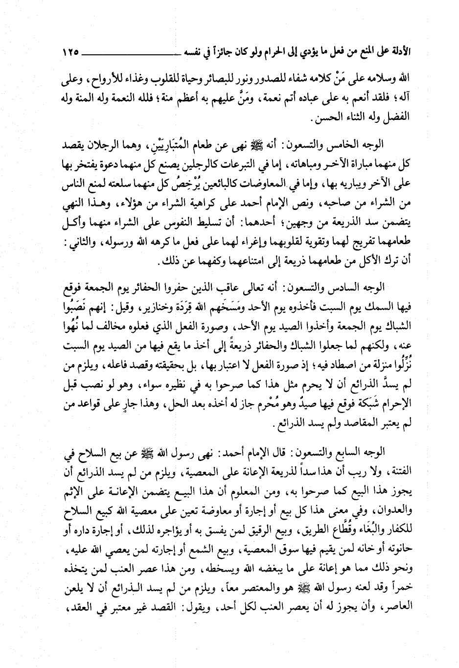 الْوَجْهُ السَّابِعُ وَالتِّسْعُونَ: قَالَ الْإِمَامُ أَحْمَدُ: نَهَى رَسُولُ اللَّهِ - صَلَّى اللَّهُ عَلَيْهِ وَسَلَّمَ - عَنْ بَيْعِ السِّلَاحِ فِي الْفِتْنَةِ، وَلَا رَيْبَ أَنَّ هَذَا سَدًّا لِذَرِيعَةِ الْإِعَانَةِ عَلَى الْمَعْصِيَةِ، وَيَلْزَمُ مَنْ لَمْ يَسُدَّ الذَّرَائِعَ أَنْ يُجَوِّزَ هَذَا الْبَيْعَ كَمَا صَرَّحُوا بِهِ، وَمِنْ الْمَعْلُومِ أَنَّ هَذَا الْبَيْعَ يَتَضَمَّنُ الْإِعَانَةَ عَلَى الْإِثْمِ وَالْعُدْوَانِ، وَفِي مَعْنَى هَذَا كُلُّ بَيْعٍ أَوْ إجَارَةٍ أَوْ مُعَاوَضَةٍ تُعِينُ عَلَى مَعْصِيَةِ اللَّهِ كَبَيْعِ السِّلَاحِ لِلْكُفَّارِ وَالْبُغَاةِ وَقُطَّاعِ الطَّرِيقِ، وَبَيْعِ الرَّقِيقِ لِمَنْ يَفْسُقُ بِهِ أَوْ يُؤَاجِرُهُ لِذَلِكَ، أَوْ إجَارَةُ دَارِهِ أَوْ حَانُوتِهِ أَوْ خَانِهِ لِمَنْ يُقِيمُ فِيهَا سُوقَ الْمَعْصِيَةِ، وَبَيْعِ الشَّمْعِ أَوْ إجَارَتِهِ لِمَنْ يَعْصِي اللَّهَ عَلَيْهِ، وَنَحْوِ ذَلِكَ مِمَّا هُوَ إعَانَةٌ عَلَى مَا يُبْغِضُهُ اللَّهُ وَيُسْخِطُهُ، وَمِنْ هَذَا عَصْرُ الْعِنَبِ لِمَنْ يَتَّخِذُهُ خَمْرًا وَقَدْ لَعَنَهُ رَسُولُ اللَّهِ - صَلَّى اللَّهُ عَلَيْهِ وَسَلَّمَ - هُوَ وَالْمُعْتَصِرَ مَعًا، وَيَلْزَمُ مَنْ لَمْ يَسُدَّ الذَّرَائِعَ أَنْ لَا يَلْعَنَ الْعَاصِرَ، وَأَنْ يُجَوِّزَ لَهُ أَنْ يَعْصِرَ الْعِنَبَ لِكُلِّ أَحَدٍ، وَيَقُولَ: الْقَصْدُ غَيْرُ مُعْتَبَرٍ فِي الْعَقْدِ،