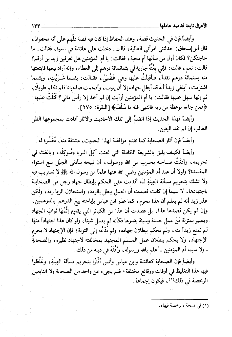 وَأَيْضًا فَكَيْفَ يَلِيقُ بِالشَّرِيعَةِ الْكَامِلَةِ الَّتِي لَعَنَتْ آكِلَ الرِّبَا وَمُوكِلَهُ، وَبَالَغَتْ فِي تَحْرِيمِهِ، وَآذَنَتْ صَاحِبَهُ بِحَرْبٍ مِنْ اللَّهِ وَرَسُولِهِ، أَنْ تُبِيحَهُ بِأَدْنَى الْحِيَلِ مَعَ اسْتِوَاءِ الْمَفْسَدَةِ؟ وَلَوْلَا أَنَّ عِنْدَ أُمِّ الْمُؤْمِنِينَ - رَضِيَ اللَّهُ عَنْهَا - عِلْمًا مِنْ رَسُولِ اللَّهِ - صَلَّى اللَّهُ عَلَيْهِ وَسَلَّمَ - لَا تَسْتَرِيبُ فِيهِ وَلَا تَشُكُّ بِتَحْرِيمِ مَسْأَلَةِ الْعِينَةِ لَمَا أَقْدَمَتْ عَلَى الْحُكْمِ بِإِبْطَالِ جِهَادِ رَجُلٍ مِنْ الصَّحَابَةِ بِاجْتِهَادِهَا، لَا سِيَّمَا إنْ كَانَتْ قَصَدَتْ أَنَّ الْعَمَلَ يَبْطُلُ بِالرِّدَّةِ، وَاسْتِحْلَالُ الرِّبَا رِدَّةٌ، وَلَكِنَّ عُذْرَ زَيْدٍ أَنَّهُ لَمْ يَعْلَمْ أَنَّ هَذَا مُحَرَّمٌ، كَمَا عُذِرَ ابْنُ عَبَّاسٍ بِإِبَاحَتِهِ بَيْعَ الدِّرْهَمِ بِالدِّرْهَمَيْنِ، وَإِنْ لَمْ يَكُنْ قَصْدُهَا هَذَا، بَلْ قَصَدَتْ أَنَّ هَذَا مِنْ الْكَبَائِرِ الَّتِي يُقَاوِمُ إثْمُهَا ثَوَابَ الْجِهَادِ وَيَصِيرُ بِمَنْزِلَةِ مَنْ عَمِلَ حَسَنَةً وَسَيِّئَةً بِقَدْرِهَا فَكَأَنَّهُ لَمْ يَعْمَلْ شَيْئًا، وَلَوْ كَانَ هَذَا اجْتِهَادًا مِنْهَا لَمْ تَمْنَعْ زَيْدًا مِنْهُ، وَلَمْ تَحْكُمْ بِبُطْلَانِ جِهَادِهِ، وَلَمْ تَدْعُهُ إلَى التَّوْبَةِ؛ فَإِنَّ الِاجْتِهَادَ لَا يُحَرِّمُ الِاجْتِهَادَ، وَلَا يُحْكَمُ بِبُطْلَانِ عَمَلِ الْمُسْلِمِ الْمُجْتَهِدِ بِمُخَالَفَتِهِ لِاجْتِهَادِ نَظِيرِهِ، وَالصَّحَابَةُ - وَلَا سِيَّمَا أُمُّ الْمُؤْمِنِينَ - أَعْلَمُ بِاَللَّهِ وَرَسُولِهِ، وَأَفْقَهُ فِي دِينِهِ مِنْ ذَلِكَ.