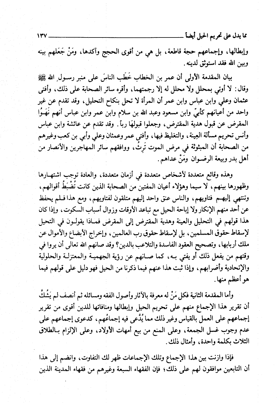 وَأَمَّا الْمُقَدِّمَةُ الثَّانِيَةُ فَكُلُّ مَنْ لَهُ مَعْرِفَةٌ بِالْآثَارِ وَأُصُولِ الْفِقْهِ وَمَسَائِلِهِ ثُمَّ أَنْصَفَ لَمْ يَشُكَّ أَنَّ تَقْرِيرَ هَذَا الْإِجْمَاعِ مِنْهُمْ عَلَى تَحْرِيمِ الْحِيَلِ وَإِبْطَالِهَا وَمُنَافَاتِهَا لِلدِّينِ أَقْوَى مِنْ تَقْرِيرِ إجْمَاعِهِمْ عَلَى الْعَمَلِ بِالْقِيَاسِ وَغَيْرِ ذَلِكَ مِمَّا يُدَّعَى فِيهِ إجْمَاعُهُمْ، كَدَعْوَى إجْمَاعِهِمْ عَلَى عَدَمِ وُجُوبِ غُسْلِ الْجُمُعَةِ، وَعَلَى الْمَنْعِ مِنْ بَيْعِ أُمَّهَاتِ الْأَوْلَادِ، وَعَلَى الْإِلْزَامِ بِالطَّلَاقِ الثَّلَاثِ بِكَلِمَةٍ وَاحِدَةٍ، وَأَمْثَالِ ذَلِكَ.