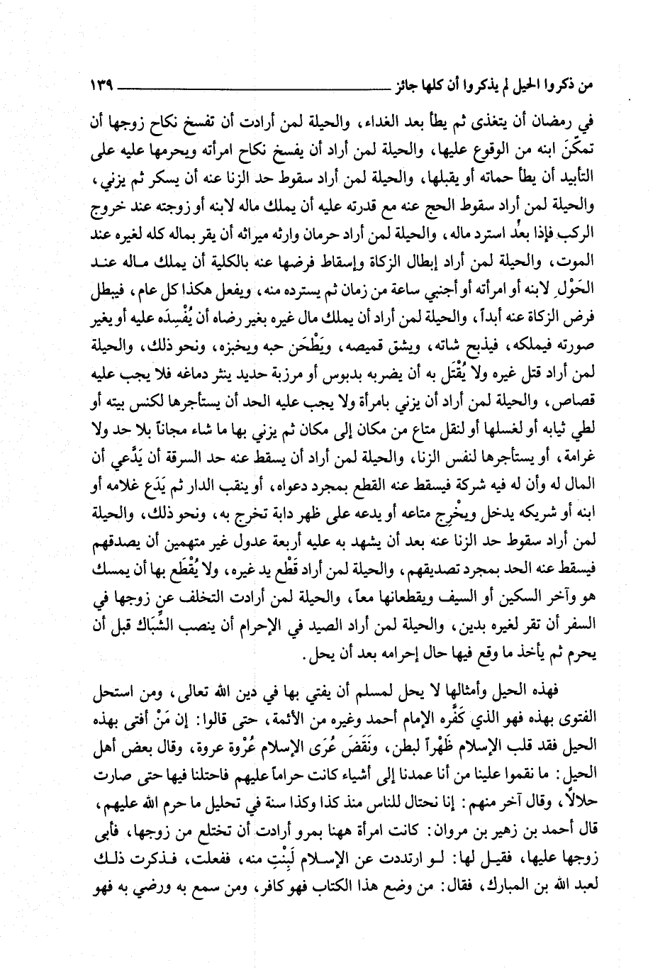 فِي رَمَضَانَ أَنْ يَتَغَدَّى ثُمَّ يَطَأَ بَعْدَ الْغَدَاءِ، وَالْحِيلَةُ لِمَنْ أَرَادَتْ أَنْ تَفْسَخَ نِكَاحَ زَوْجِهَا أَنْ تُمَكِّنَ ابْنَهُ مِنْ الْوُقُوعِ عَلَيْهَا، وَالْحِيلَةُ لِمَنْ أَرَادَ أَنْ يَفْسَخَ نِكَاحَ امْرَأَتِهِ وَيُحَرِّمَهَا عَلَيْهِ عَلَى التَّأْبِيدِ أَنْ يَطَأَ حَمَاتَهُ أَوْ يُقَبِّلَهَا، وَالْحِيلَةُ لِمَنْ أَرَادَ سُقُوطَ حَدِّ الزِّنَا عَنْهُ أَنْ يَسْكَرَ ثُمَّ يَزْنِيَ، وَالْحِيلَةُ لِمَنْ أَرَادَ سُقُوطَ الْحَجِّ عَنْهُ مَعَ قُدْرَتِهِ عَلَيْهِ أَنْ يُمَلِّكَ مَالَهُ لِابْنِهِ أَوْ زَوْجَتِهِ عِنْدَ خُرُوجِ الرَّكْبِ فَإِذَا بَعُدَ اسْتَرَدَّ مَالَهُ، وَالْحِيلَةُ لِمَنْ أَرَادَ حِرْمَانَ وَارِثِهِ مِيرَاثَهُ أَنْ يُقِرَّ بِمَالِهِ كُلِّهِ لِغَيْرِهِ عِنْدَ الْمَوْتِ وَالْحِيلَةُ لِمَنْ أَرَادَ إبْطَالَ الزَّكَاةِ وَإِسْقَاطَ فَرْضِهَا عَنْهُ بِالْكُلِّيَّةِ أَنْ يُمَلِّكَ مَالَهُ عِنْدَ الْحَوْلِ لِابْنِهِ أَوْ امْرَأَتِهِ أَوْ أَجْنَبِيٍّ سَاعَةً مِنْ زَمَانٍ ثُمَّ يَسْتَرِدَّهُ مِنْهُ، وَيَفْعَلُ هَكَذَا كُلَّ عَامٍ، فَيَبْطُلُ فَرْضُ الزَّكَاةِ عَنْهُ أَبَدًا، وَالْحِيلَةُ لِمَنْ أَرَادَ أَنْ يَمْلِكَ مَالَ غَيْرِهِ بِغَيْرِ رِضَاهُ أَنْ يُفْسِدَهُ عَلَيْهِ أَوْ يُغَيِّرَ صُورَتَهُ فَيَمْلِكَهُ، فَيَذْبَحَ شَاتَه، وَيَشُقَّ قَمِيصَهُ، وَيَطْحَنَ حَبَّهُ وَيَخْبِزَهُ، وَنَحْوُ ذَلِكَ.