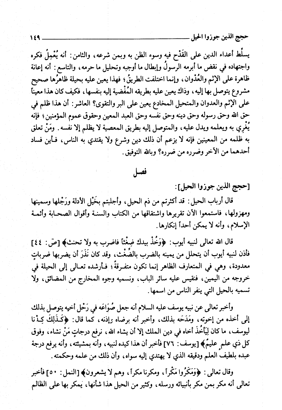 [حُجَجُ الَّذِينَ جَوَّزُوا الْحِيَلَ] : قَالَ أَرْبَابُ الْحِيَلِ: قَدْ أَكْثَرْتُمْ مِنْ ذَمِّ الْحِيَلِ، وَأَجْلَبْتُمْ بِخَيْلِ الْأَدِلَّةِ وَرَجْلِهَا وَسَمِينِهَا وَمَهْزُولِهَا، فَاسْتَمِعُوا الْآنَ تَقْرِيرَهَا وَاشْتِقَاقَهَا مِنْ الْكِتَابِ وَالسُّنَّةِ وَأَقْوَالِ الصَّحَابَةِ وَأَئِمَّةِ الْإِسْلَامِ، وَأَنَّهُ لَا يُمْكِنُ أَحَدًا إنْكَارُهَا.