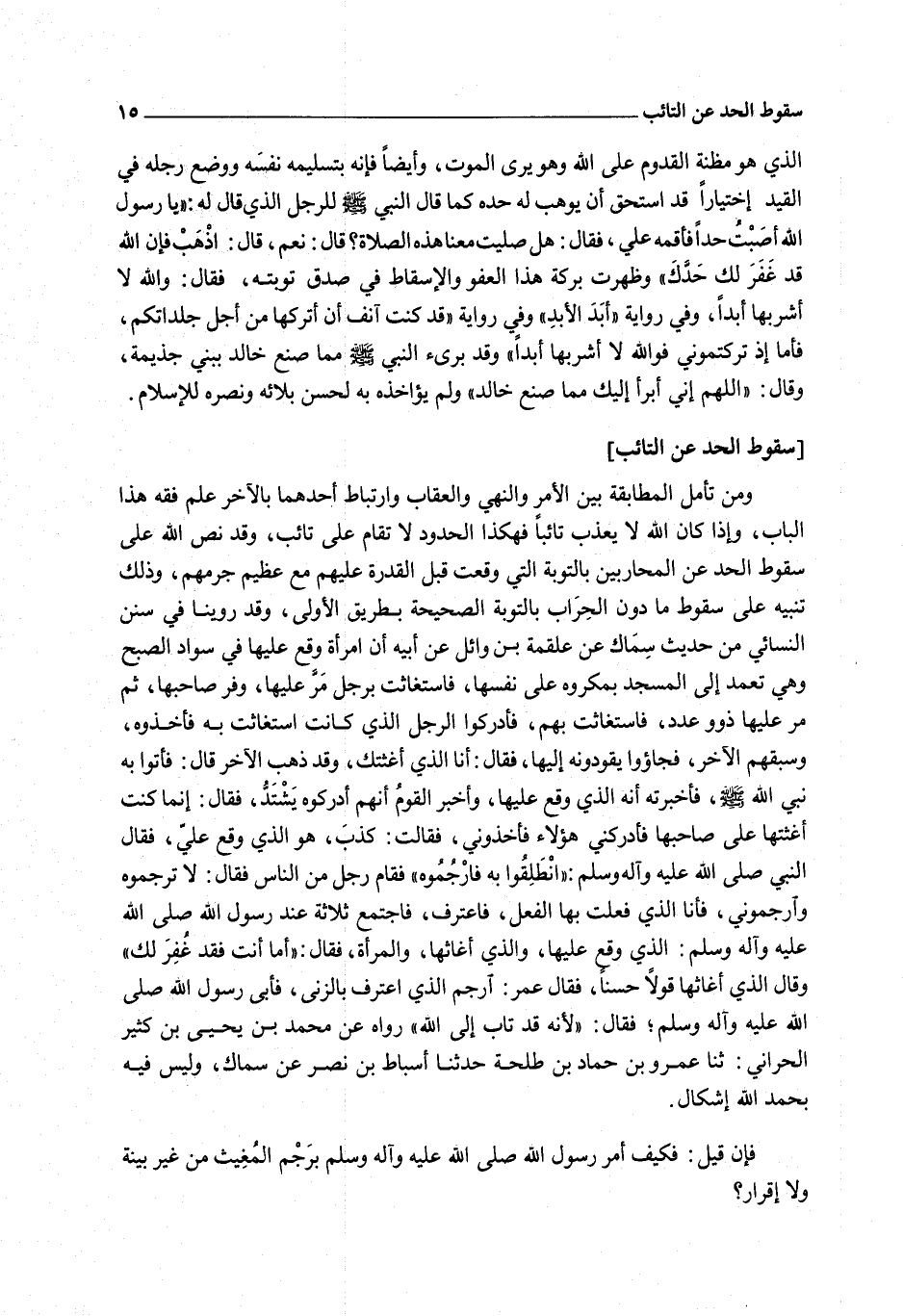 وَمَنْ تَأَمَّلَ الْمُطَابَقَةَ بَيْنَ الْأَمْرِ وَالنَّهْيِ وَالْعِقَابِ وَارْتِبَاطِ أَحَدِهِمَا بِالْآخَرِ عَلِمَ فِقْهَ هَذَا الْبَابِ، وَإِذَا كَانَ اللَّهُ لَا يُعَذِّبُ تَائِبًا فَهَكَذَا الْحُدُودُ لَا تُقَامُ عَلَى تَائِبٍ، وَقَدْ نَصَّ اللَّهُ عَلَى سُقُوطِ الْحَدِّ عَنْ الْمُحَارِبِينَ بِالتَّوْبَةِ الَّتِي وَقَعَتْ قَبْلَ الْقُدْرَةِ عَلَيْهِمْ مَعَ عَظِيمِ جُرْمِهِمْ، وَذَلِكَ تَنْبِيهٌ عَلَى سُقُوطِ مَا دُونَ الْحِرَابِ بِالتَّوْبَةِ الصَّحِيحَةِ بِطَرِيقِ الْأَوْلَى، وَقَدْ رَوَيْنَا فِي سُنَنِ النَّسَائِيّ مِنْ حَدِيثِ سِمَاكٍ عَنْ عَلْقَمَةَ بْنِ وَائِلٍ عَنْ أَبِيهِ «أَنَّ امْرَأَةً وَقَعَ عَلَيْهَا فِي سَوَادِ الصُّبْحِ وَهِيَ تَعْمَدُ إلَى الْمَسْجِدِ بِمَكْرُوهٍ عَلَى نَفْسِهَا، فَاسْتَغَاثَتْ بِرَجُلٍ مَرَّ عَلَيْهَا، وَفَرَّ صَاحِبُهَا، ثُمَّ مَرَّ عَلَيْهَا ذَوُو عَدَدٍ، فَاسْتَغَاثَتْ بِهِمْ، فَأَدْرَكُوا الرَّجُلَ الَّذِي كَانَتْ اسْتَغَاثَتْ بِهِ فَأَخَذُوهُ، وَسَبَقَهُمْ الْآخَرُ، فَجَاءُوا يَقُودُونَهُ إلَيْهَا، فَقَالَ: أَنَا الَّذِي أَغَثْتُك، وَقَدْ ذَهَبَ الْآخَرُ قَالَ: فَأَتَوْا بِهِ نَبِيَّ اللَّهِ - صَلَّى اللَّهُ عَلَيْهِ وَسَلَّمَ -، فَأَخْبَرَتْهُ أَنَّهُ الَّذِي وَقَعَ عَلَيْهَا، وَأَخْبَرَ الْقَوْمُ أَنَّهُمْ أَدْرَكُوهُ يَشْتَدُّ، فَقَالَ: إنَّمَا كُنْت أَغَثْتهَا عَلَى صَاحِبِهَا فَأَدْرَكَنِي هَؤُلَاءِ فَأَخَذُونِي، فَقَالَتْ: كَذَبَ، هُوَ الَّذِي وَقَعَ عَلَيَّ، فَقَالَ النَّبِيُّ - صَلَّى اللَّهُ عَلَيْهِ وَآلِهِ وَسَلَّمَ -: انْطَلَقُوا بِهِ فَارْجُمُوهُ فَقَامَ رَجُلٌ مِنْ النَّاس فَقَالَ: لَا تَرْجُمُوهُ وَارْجُمُونِي، فَأَنَا الَّذِي فَعَلْت بِهَا الْفِعْلَ، فَاعْتَرَفَ، فَاجْتَمَعَ ثَلَاثَةٌ عِنْدَ رَسُولِ اللَّهِ - صَلَّى اللَّهُ عَلَيْهِ وَسَلَّمَ -: الَّذِي وَقَعَ عَلَيْهَا، وَاَلَّذِي أَغَاثَهَا، وَالْمَرْأَةُ، فَقَالَ: أَمَّا أَنْتَ فَقَدْ غُفِرَ لَك وَقَالَ لِلَّذِي أَغَاثَهَا قَوْلًا حَسَنًا، فَقَالَ عُمَرُ: اُرْجُمْ الَّذِي اعْتَرَفَ بِالزِّنَى، فَأَبَى رَسُولُ اللَّهِ - صَلَّى اللَّهُ عَلَيْهِ وَآلِهِ وَسَلَّمَ -؛ فَقَالَ: لِأَنَّهُ قَدْ تَابَ إلَى اللَّهِ» رَوَاهُ عَنْ مُحَمَّدِ بْنِ يَحْيَى بْنِ كَثِيرٍ الْحَرَّانِيِّ: ثنا عَمْرُو بْنُ حَمَّادِ بْنِ طَلْحَةَ حَدَّثَنَا أَسْبَاطُ بْنُ نَصْرٍ عَنْ سِمَاكٍ، وَلَيْسَ فِيهِ بِحَمْدِ اللَّهِ إشْكَالٌ.