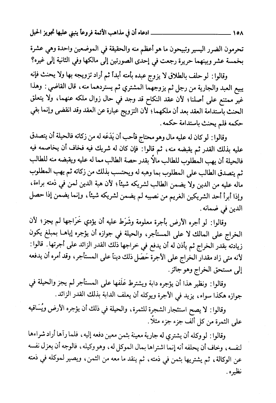 وَقَالُوا: وَنَظِيرُ هَذَا أَنْ يُؤَجِّرَهُ دَابَّةً وَيَشْتَرِطَ عَلَفَهَا عَلَى الْمُسْتَأْجِرِ لَمْ يَجُزْ وَالْحِيلَةُ فِي جَوَازِهِ هَكَذَا سَوَاءٌ، يَزِيدُ فِي الْأُجْرَةِ وَيُوَكِّلَهُ أَنْ يَعْلِفَ الدَّابَّةَ بِذَلِكَ الْقَدْرِ الزَّائِدِ.