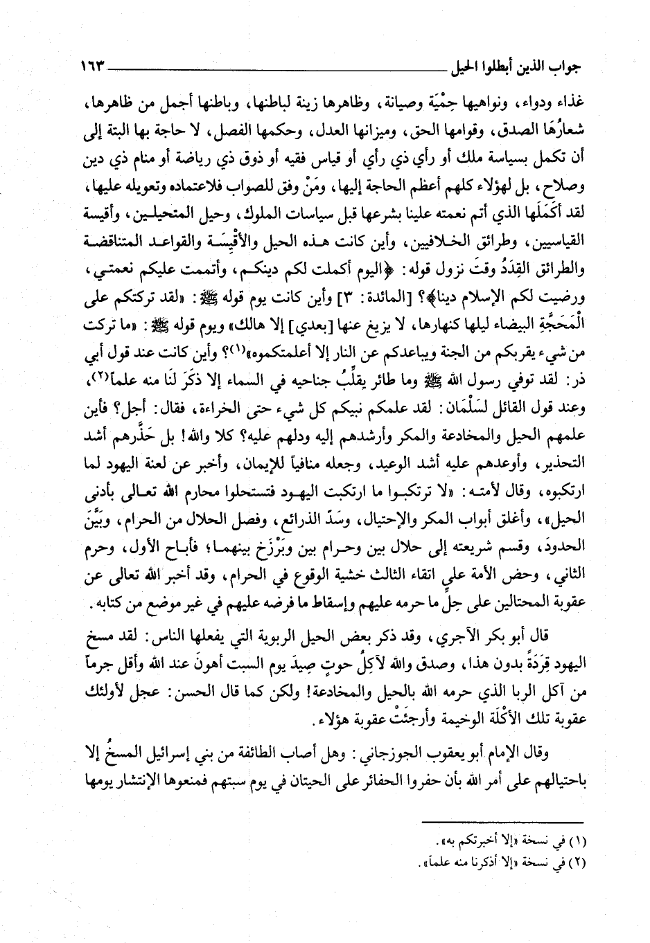 وَعِنْدَ قَوْلِ الْقَائِلِ لِسَلْمَانَ: لَقَدْ عَلَّمَكُمْ نَبِيُّكُمْ كُلَّ شَيْءٍ حَتَّى الْخِرَاءَةَ، فَقَالَ: أَجَلْ؟ فَأَيْنَ عَلَّمَهُمْ الْحِيَلَ وَالْمُخَادَعَةَ وَالْمَكْرَ وَأَرْشَدَهُمْ إلَيْهِ وَدَلَّهُمْ عَلَيْهِ؟ كَلًّا وَاَللَّهِ، بَلْ حَذَّرَهُمْ أَشَدَّ التَّحْذِيرِ، وَأَوْعَدَهُمْ عَلَيْهِ أَشَدَّ الْوَعِيدِ، وَجَعَلَهُ مُنَافِيًا لِلْإِيمَانِ، وَأَخْبَرَ عَنْ لَعْنَةِ الْيَهُودِ لِمَا ارْتَكَبُوهُ، وَقَالَ لِأُمَّتِهِ: «لَا تَرْتَكِبُوا مَا ارْتَكَبَتْ الْيَهُودُ فَتَسْتَحِلُّوا مَحَارِمَ اللَّهِ تَعَالَى بِأَدْنَى الْحِيَلِ» ، وَأَغْلَقَ أَبْوَابَ الْمَكْرِ وَالِاحْتِيَالِ، وَسَدَّ الذَّرَائِعَ، وَفَصَّلَ الْحَلَالَ مِنْ الْحَرَامِ، وَبَيَّنَ الْحُدُودَ، وَقَسَّمَ شَرِيعَتَهُ إلَى حَلَالٍ بَيِّنٍ وَحَرَامٍ بَيِّنٍ، وَبَرْزَخَ بَيْنَهُمَا؛ فَأَبَاحَ الْأَوَّلَ، وَحَرَّمَ الثَّانِي، وَحَضَّ الْأُمَّةَ عَلَى اتِّقَاءِ الثَّالِثِ خَشْيَةَ الْوُقُوعِ فِي الْحَرَامِ، وَقَدْ أَخْبَرَ اللَّهُ تَعَالَى عَنْ عُقُوبَةِ الْمُحْتَالِينَ عَلَى حِلِّ مَا حَرَّمَهُ عَلَيْهِمْ وَإِسْقَاطِ مَا فَرَضَهُ عَلَيْهِمْ فِي غَيْرِ مَوْضِعٍ مِنْ كِتَابِهِ.