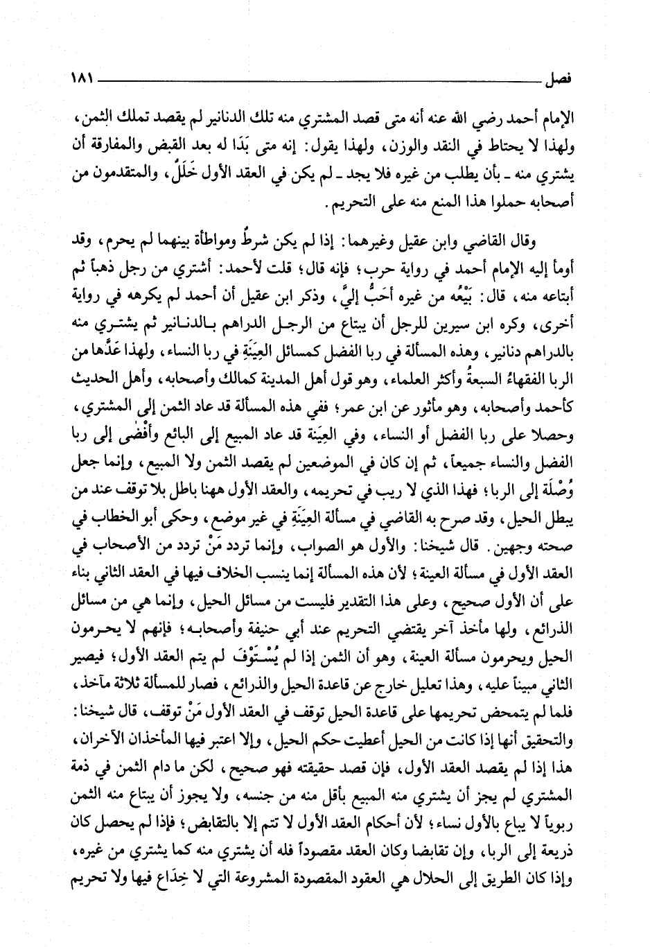 الْإِمَامُ أَحْمَدَ - رَضِيَ اللَّهُ عَنْهُ - أَنَّهُ مَتَى قَصَدَ الْمُشْتَرِي مِنْهُ تِلْكَ الدَّنَانِيرَ لَمْ يَقْصِدْ تَمَلُّكَ الثَّمَنِ، وَلِهَذَا لَا يَحْتَاطُ فِي النَّقْدِ وَالْوَزْنِ، وَلِهَذَا يَقُولُ: إنَّهُ مَتَى بَدَا لَهُ بَعْدَ الْقَبْضِ وَالْمُفَارَقَةِ أَنْ يَشْتَرِيَ مِنْهُ - بِأَنْ يَطْلُبَ مِنْ غَيْرِهِ فَلَا يَجِدُ - لَمْ يَكُنْ فِي الْعَقْدِ الْأَوَّلِ خَلَلٌ، وَالْمُتَقَدِّمُونَ مِنْ أَصْحَابِهِ حَمَلُوا هَذَا الْمَنْعَ مِنْهُ عَلَى التَّحْرِيمِ.