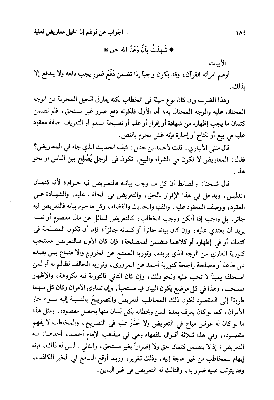 قَالَ مُثَنَّى الْأَنْبَارِيُّ: قُلْتُ لِأَحْمَدَ بْنِ حَنْبَلٍ: كَيْفَ الْحَدِيثُ الَّذِي جَاءَ فِي الْمَعَارِيضِ؟ فَقَالَ: الْمَعَارِيضُ لَا تَكُونُ فِي الشِّرَاءِ وَالْبَيْعِ، تَكُونُ فِي الرَّجُلِ يُصْلِحُ بَيْنَ النَّاسِ أَوْ نَحْوِ هَذَا.