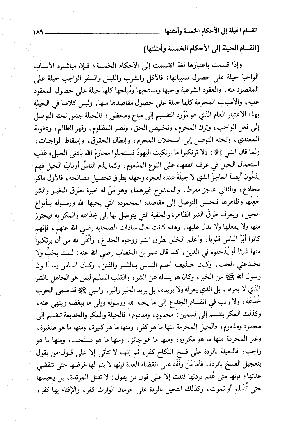 وَإِذَا قُسِمَتْ بِاعْتِبَارِهَا لُغَةً انْقَسَمَتْ إلَى الْأَحْكَامِ الْخَمْسَةِ؛ فَإِنَّ مُبَاشَرَةَ الْأَسْبَابِ الْوَاجِبَةِ حِيلَةٌ عَلَى حُصُولِ مُسَبِّبَاتِهَا؛ فَالْأَكْلُ وَالشُّرْبُ وَاللُّبْسُ وَالسَّفَرُ الْوَاجِبُ حِيلَةٌ عَلَى الْمَقْصُودِ مِنْهُ، وَالْعُقُودُ الشَّرْعِيَّةُ وَاجِبُهَا وَمُسْتَحَبُّهَا وَمُبَاحُهَا كُلُّهَا حِيلَةٌ عَلَى حُصُولِ الْمَعْقُودِ عَلَيْهِ، وَالْأَسْبَابُ الْمُحَرَّمَةُ كُلُّهَا حِيلَةٌ عَلَى حُصُولِ مَقَاصِدِهَا مِنْهَا، وَلَيْسَ كَلَامُنَا فِي الْحِيلَةِ بِهَذَا الِاعْتِبَارِ الْعَامِّ الَّذِي هُوَ مَوْرِدُ التَّقْسِيمِ إلَى مُبَاحٍ وَمَحْظُورٍ؛ فَالْحِيلَةُ جِنْسٌ تَحْتَهُ التَّوَصُّلُ إلَى فِعْلِ الْوَاجِبِ، وَتَرْكِ الْمُحَرَّمِ، وَتَخْلِيصُ الْحَقِّ، وَنَصْرُ الْمَظْلُومِ، وَقَهْرُ الظَّالِمِ، وَعُقُوبَةُ الْمُعْتَدِي، وَتَحْتَهُ التَّوَصُّلُ إلَى اسْتِحْلَالِ الْمُحَرَّمِ، وَإِبْطَالِ الْحُقُوقِ، وَإِسْقَاطِ الْوَاجِبَاتِ، وَلَمَّا قَالَ النَّبِيُّ - صَلَّى اللَّهُ عَلَيْهِ وَسَلَّمَ -: «لَا تَرْتَكِبُوا مَا ارْتَكَبَتْ الْيَهُودُ فَتَسْتَحِلُّوا مَحَارِمَ اللَّهِ بِأَدْنَى الْحِيَلِ» غَلَبَ اسْتِعْمَالُ الْحِيَلِ فِي عُرْفِ الْفُقَهَاءِ عَلَى النَّوْعِ الْمَذْمُومِ، وَكَمَا يَذُمُّ النَّاسُ أَرْبَابَ الْحِيَلِ فَهُمْ يَذُمُّونَ أَيْضًا الْعَاجِزَ الَّذِي لَا حِيلَةَ عِنْدَهُ لِعَجْزِهِ وَجَهْلِهِ بِطُرُقِ تَحْصِيلِ مَصَالِحِهِ، فَالْأَوَّلُ مَاكِرٌ مُخَادِعٌ، وَالثَّانِي عَاجِزٌ مُفَرِّطٌ، وَالْمَمْدُوحُ غَيْرُهُمَا، وَهُوَ مَنْ لَهُ خِبْرَةٌ بِطُرُقِ الْخَيْرِ وَالشَّرِّ خَفِيِّهَا وَظَاهِرِهَا فَيُحْسِنُ التَّوَصُّلَ إلَى مَقَاصِدِهِ الْمَحْمُودَةِ الَّتِي يُحِبُّهَا اللَّهُ وَرَسُولُهُ بِأَنْوَاعِ الْحِيَلِ، وَيَعْرِفُ طُرُقَ الشَّرِّ الظَّاهِرَةِ وَالْخَفِيَّةِ الَّتِي يُتَوَصَّلُ بِهَا إلَى خِدَاعِهِ وَالْمَكْرِ بِهِ فَيَحْتَرِزَ مِنْهَا وَلَا يَفْعَلُهَا وَلَا يَدُلُّ عَلَيْهَا، وَهَذِهِ كَانَتْ حَالُ سَادَاتِ الصَّحَابَةِ - رَضِيَ اللَّهُ عَنْهُمْ -، فَإِنَّهُمْ كَانُوا أَبَرَّ النَّاسِ قُلُوبًا، وَأَعْلَمَ الْخَلْقِ بِطُرُقِ الشَّرِّ وَوُجُوهِ الْخِدَاعِ، وَأَتْقَى لِلَّهِ مِنْ أَنْ يَرْتَكِبُوا مِنْهَا شَيْئًا أَوْ يُدْخِلُوهُ فِي الدِّينِ، كَمَا قَالَ عُمَرُ بْنُ الْخَطَّابِ - رَضِيَ اللَّهُ عَنْهُ -: لَسْتُ بِخِبٍّ وَلَا يَخْدَعُنِي الْخِبُّ، وَكَانَ حُذَيْفَةُ أَعْلَمَ النَّاسِ بِالشَّرِّ وَالْفِتَنِ، وَكَانَ النَّاسُ يَسْأَلُونَ رَسُولَ اللَّهِ - صَلَّى اللَّهُ عَلَيْهِ وَسَلَّمَ - عَنْ الْخَيْرِ، وَكَانَ هُوَ يَسْأَلُهُ عَنْ الشَّرِّ، وَالْقَلْبُ السَّلِيمُ لَيْسَ هُوَ الْجَاهِلُ بِالشَّرِّ الَّذِي لَا يَعْرِفُهُ، بَلْ الَّذِي يَعْرِفُهُ وَلَا يُرِيدُهُ، بَلْ يُرِيدُ الْخَيْرَ وَالْبِرَّ، وَالنَّبِيُّ - صَلَّى اللَّهُ عَلَيْهِ وَسَلَّمَ - قَدْ سَمَّى الْحَرْبَ خُدْعَةً، وَلَا رَيْبَ فِي انْقِسَامِ الْخِدَاعِ إلَى مَا يُحِبُّهُ اللَّهُ وَرَسُولُهُ وَإِلَى مَا يُبْغِضُهُ وَيَنْهَى عَنْهُ، وَكَذَلِكَ الْمَكْرُ يَنْقَسِمُ إلَى قِسْمَيْنِ: مَحْمُودٌ، وَمَذْمُومٌ؛ فَالْحِيلَةُ وَالْمَكْرُ وَالْخَدِيعَةُ تَنْقَسِمُ إلَى مَحْمُودٍ وَمَذْمُومٍ.