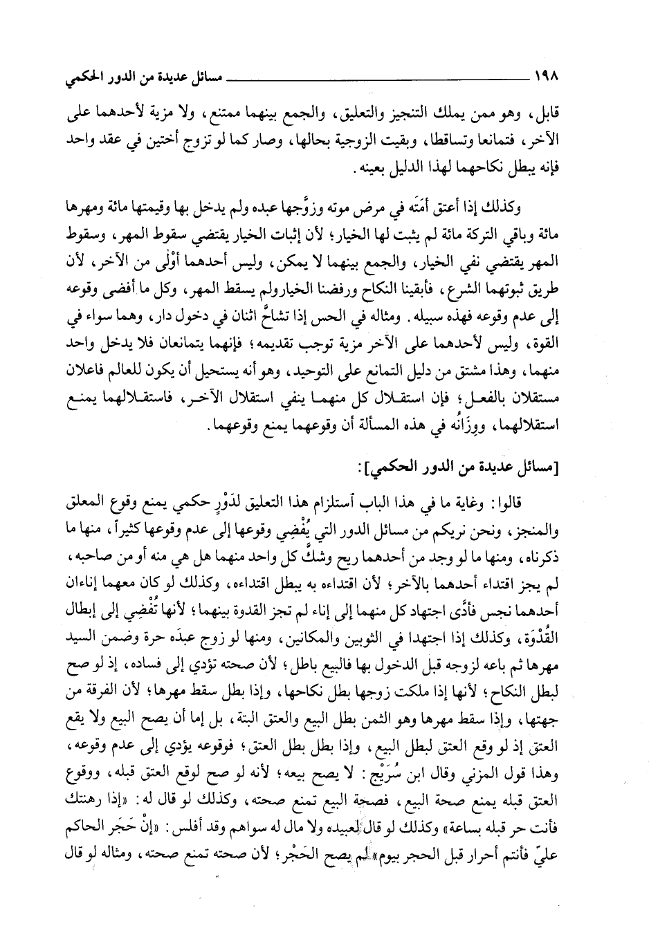 قَالُوا: وَغَايَةُ مَا فِي هَذَا الْبَابِ اسْتِلْزَامُ هَذَا التَّعْلِيقِ لِدَوْرٍ حُكْمِيٍّ يَمْنَعُ وُقُوعَ الْمُعَلَّقِ وَالْمُنَجَّزِ، وَنَحْنُ نُرِيكُمْ مِنْ مَسَائِلِ الدَّوْرِ الَّتِي يُفْضِي وُقُوعُهَا إلَى عَدَمِ وُقُوعِهَا كَثِيرًا، مِنْهَا مَا ذَكَرْنَاهُ، وَمِنْهَا مَا لَوْ وُجِدَ مِنْ أَحَدِهِمَا رِيحٌ وَشَكَّ كُلُّ وَاحِدٍ مِنْهُمَا هَلْ هِيَ مِنْهُ أَوْ مِنْ صَاحِبِهِ، لَمْ يَجُزْ اقْتِدَاءُ أَحَدِهِمَا بِالْآخَرِ؛ لِأَنَّ اقْتِدَاءَهُ بِهِ يُبْطِلُ اقْتِدَاءَهُ، وَكَذَلِكَ لَوْ كَانَ مَعَهُمَا إنَاءَانِ أَحَدُهُمَا نَجِسٌ فَأَدَّى اجْتِهَادُ كُلٍّ مِنْهُمَا إلَى إنَاءٍ لَمْ تَجُزْ الْقُدْوَةُ بَيْنَهُمَا؛ لِأَنَّهَا تُفْضِي إلَى إبْطَالِ الْقُدْوَةِ، وَكَذَلِكَ إذَا اجْتَهَدَا فِي الثَّوْبَيْنِ وَالْمَكَانَيْنِ، وَمِنْهَا لَوْ زَوَّجَ عَبْدَهُ حُرَّةً وَضَمِنَ السَّيِّدُ مَهْرَهَا ثُمَّ بَاعَهُ لِزَوْجِهِ قَبْلَ الدُّخُولِ بِهَا فَالْبَيْعُ بَاطِلٌ؛ لِأَنَّ صِحَّتَهُ تُؤَدِّي إلَى فَسَادِهِ، إذْ لَوْ صَحَّ لَبَطَلَ النِّكَاحُ؛ لِأَنَّهَا إذَا مَلَكَتْ زَوْجَهَا بَطَلَ نِكَاحُهَا، وَإِذَا بَطَلَ سَقَطَ مَهْرُهَا؛ لِأَنَّ الْفُرْقَةَ مِنْ جِهَتِهَا، وَإِذَا سَقَطَ مَهْرُهَا وَهُوَ الثَّمَنُ بَطَلَ الْبَيْعُ وَالْعِتْقُ أَلْبَتَّةَ، بَلْ إمَّا أَنْ يَصِحَّ الْبَيْعُ وَلَا يَقَعَ الْعِتْقُ إذْ لَوْ وَقَعَ الْعِتْقُ لَبَطَلَ الْبَيْعُ، وَإِذَا بَطَلَ بَطَلَ الْعِتْقُ؛ فَوُقُوعُهُ يُؤَدِّي إلَى عَدَمِ وُقُوعِهِ.