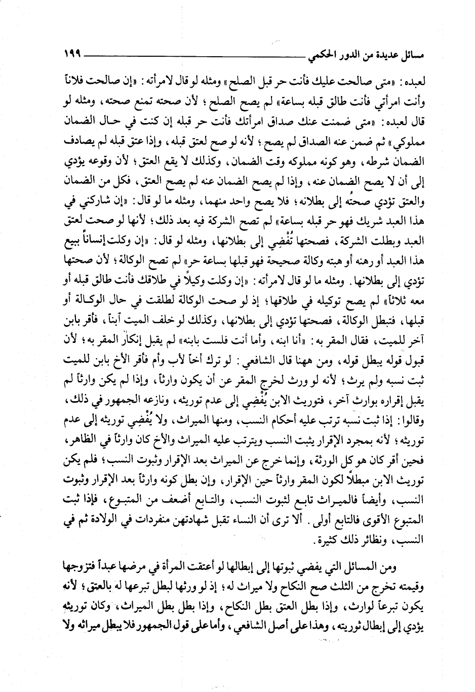وَمِثْلُهُ مَا لَوْ قَالَ لِامْرَأَتِهِ: " إنْ وَكَّلْتُ وَكِيلًا فِي طَلَاقِكِ فَأَنْتِ طَالِقٌ قَبْلَهُ أَوْ مَعَهُ ثَلَاثًا " لَمْ يَصِحَّ تَوْكِيلُهُ فِي طَلَاقِهَا؛ إذْ لَوْ صَحَّتْ الْوَكَالَةُ لَطَلُقَتْ فِي حَالِ الْوَكَالَةِ أَوْ قَبْلَهَا، فَتَبْطُلُ الْوَكَالَةُ، فَصِحَّتُهَا تُؤَدِّي إلَى بُطْلَانِهَا، وَكَذَلِكَ لَوْ خَلَفَ الْمَيِّتُ ابْنًا، فَأَقَرَّ بِابْنٍ آخَرَ لِلْمَيِّتِ، فَقَالَ الْمُقِرُّ بِهِ: " أَنَا ابْنُهُ، وَأَمَّا أَنْتَ فَلَسْتَ بِابْنِهِ " لَمْ يُقْبَلْ إنْكَارُ الْمُقِرِّ بِهِ؛ لِأَنَّ قَبُولَ قَوْلِهِ يُبْطِلُ قَوْلَهُ، وَمِنْ هَاهُنَا قَالَ الشَّافِعِيُّ: لَوْ تَرَكَ أَخًا لِأَبٍ وَأُمٍّ فَأَقَرَّ الْأَخُ بِابْنٍ لِلْمَيِّتِ ثَبَتَ نَسَبُهُ وَلَمْ يَرِثْ؛ لِأَنَّهُ لَوْ وَرِثَ لَخَرَجَ الْمُقِرُّ عَنْ أَنْ يَكُونَ وَارِثًا، وَإِذَا لَمْ يَكُنْ وَارِثًا لَمْ يُقْبَلْ إقْرَارُهُ بِوَارِثٍ آخَرَ، فَتَوْرِيثُ الِابْنِ يُفْضِي إلَى عَدَمِ تَوْرِيثِهِ، وَنَازَعَهُ الْجُمْهُورُ فِي ذَلِكَ، وَقَالُوا: إذَا ثَبَتَ نَسَبُهُ تَرَتَّبَ عَلَيْهِ أَحْكَامُ النَّسَبِ، وَمِنْهَا الْمِيرَاثُ، وَلَا يُفْضِي تَوْرِيثُهُ إلَى عَدَمِ تَوْرِيثِهِ؛ لِأَنَّهُ بِمُجَرَّدِ الْإِقْرَارِ يَثْبُتُ النَّسَبُ وَيَتَرَتَّبُ عَلَيْهِ الْمِيرَاثُ وَالْأَخُ كَانَ وَارِثًا فِي الظَّاهِرِ، فَحِينَ أَقَرَّ كَانَ هُوَ كُلُّ الْوَرَثَةِ، وَإِنَّمَا خَرَجَ عَنْ الْمِيرَاثِ بَعْدَ الْإِقْرَارِ وَثُبُوتِ النَّسَبِ؛ فَلَمْ يَكُنْ تَوْرِيثُ الِابْنِ مُبْطِلًا لِكَوْنِ الْمُقِرِّ وَارِثًا حِينَ الْإِقْرَارِ، وَإِنْ بَطَلَ كَوْنُهُ وَارِثًا بَعْدَ الْإِقْرَارِ وَثُبُوتُ النَّسَبِ، وَأَيْضًا فَالْمِيرَاثُ تَابِعٌ لِثُبُوتِ النَّسَبِ، وَالتَّابِعُ أَضْعَفُ مِنْ الْمَتْبُوعِ، فَإِذَا ثَبَتَ الْمَتْبُوعُ الْأَقْوَى فَالتَّابِعُ أَوْلَى. أَلَا تَرَى أَنَّ النِّسَاءَ تُقْبَلُ شَهَادَتُهُنَّ مُنْفَرِدَاتٍ فِي الْوِلَادَةِ ثُمَّ فِي النَّسَبِ، وَنَظَائِرُ ذَلِكَ كَثِيرَةٌ.