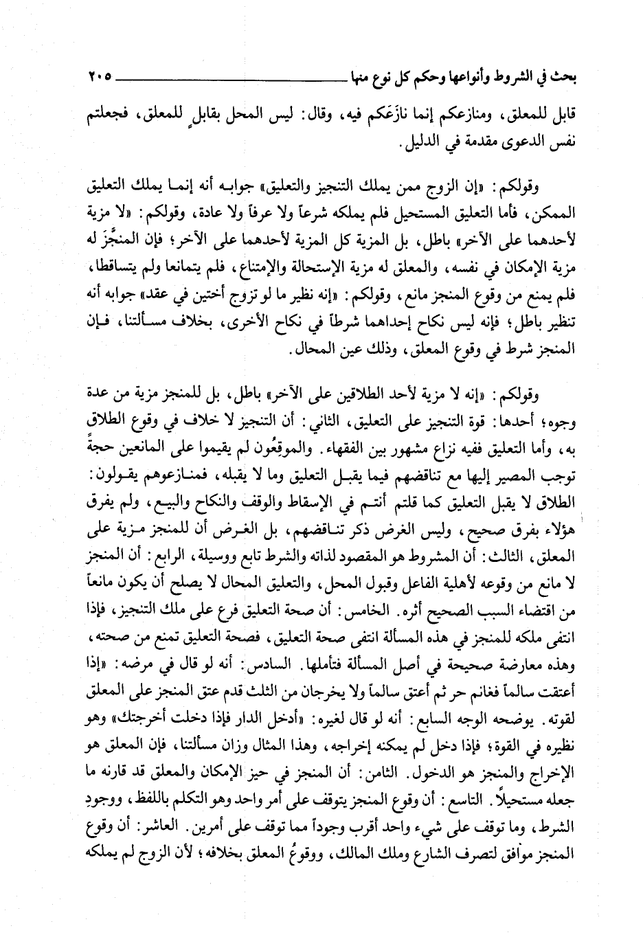 وَالْمُوَقِّعُونَ لَمْ يُقِيمُوا عَلَى الْمَانِعِينَ حُجَّةً تُوجِبُ الْمَصِيرَ إلَيْهَا مَعَ تَنَاقُضِهِمْ فِيمَا يَقْبَلُ التَّعْلِيقَ وَمَا لَا يَقْبَلُهُ، فَمُنَازِعُوهُمْ يَقُولُونَ: الطَّلَاقُ لَا يَقْبَلُ التَّعْلِيقَ كَمَا قُلْتُمْ أَنْتُمْ فِي الْإِسْقَاطِ وَالْوَقْفِ وَالنِّكَاحِ وَالْبَيْعِ، وَلَمْ يُفَرِّقْ هَؤُلَاءِ بِفَرْقٍ صَحِيحٍ، وَلَيْسَ الْغَرَضُ ذِكْرَ تَنَاقُضِهِمْ، بَلْ الْغَرَضُ أَنَّ لِلْمُنَجَّزِ مَزِيَّةً عَلَى الْمُعَلَّقِ، الثَّالِثُ: أَنَّ الْمَشْرُوطَ هُوَ الْمَقْصُودُ لِذَاتِهِ وَالشَّرْطُ تَابِعٌ وَوَسِيلَةٌ، الرَّابِعُ: أَنَّ الْمُنَجَّزَ لَا مَانِعَ مِنْ وُقُوعِهِ لِأَهْلِيَّةِ الْفَاعِلِ وَقَبُولِ الْمَحَلِّ، وَالتَّعْلِيقُ الْمُحَالُ لَا يَصْلُحُ أَنْ يَكُونَ مَانِعًا مِنْ اقْتِضَاءِ السَّبَبِ الصَّحِيحِ أَثَرَهُ.