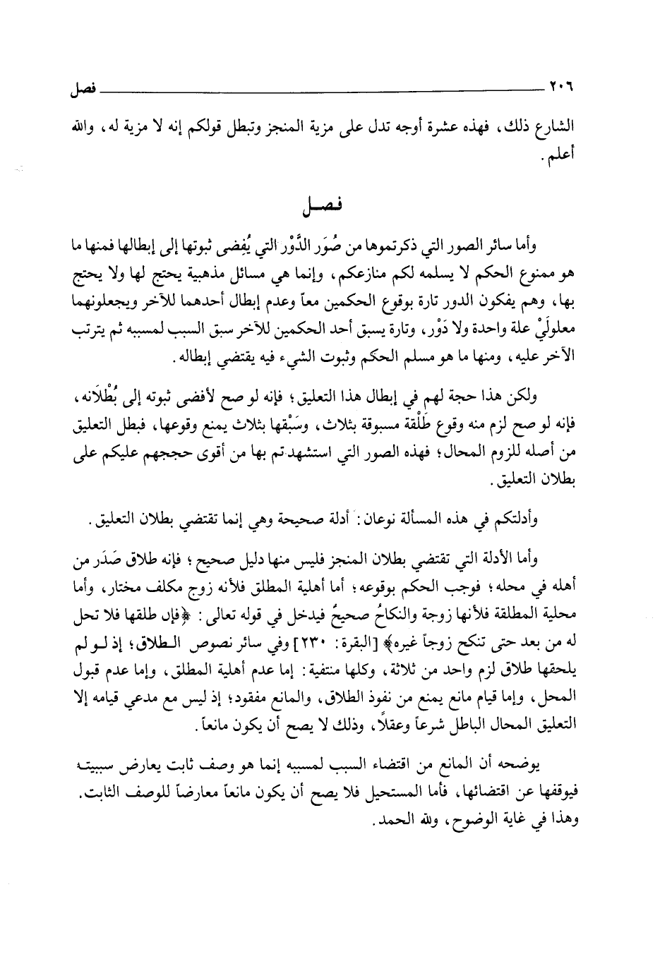 وَأَمَّا الْأَدِلَّةُ الَّتِي تَقْتَضِي بُطْلَانَ الْمُنَجَّزِ فَلَيْسَ مِنْهَا دَلِيلٌ صَحِيحٌ؛ فَإِنَّهُ طَلَاقٌ صَدَرَ مِنْ أَهْلِهِ فِي مَحَلِّهِ؛ فَوَجَبَ الْحُكْمُ بِوُقُوعِهِ؛ أَمَّا أَهْلِيَّةُ الْمُطَلِّقِ فَلِأَنَّهُ زَوْجٌ مُكَلَّفٌ مُخْتَارٌ، وَأَمَّا مَحَلِّيَّةُ الْمُطَلَّقَةِ فَلِأَنَّهَا زَوْجَةٌ وَالنِّكَاحُ صَحِيحٌ فَيَدْخُلُ فِي قَوْله تَعَالَى: {فَإِنْ طَلَّقَهَا فَلا تَحِلُّ لَهُ مِنْ بَعْدُ حَتَّى تَنْكِحَ زَوْجًا غَيْرَهُ} [البقرة: 230] وَفِي سَائِرِ نُصُوصِ الطَّلَاقِ؛ إذْ لَوْ لَمْ يَلْحَقْهَا طَلَاقٌ لَزِمَ وَاحِدٌ مِنْ ثَلَاثَةٍ، وَكُلُّهَا مُنْتَفِيَةٌ: إمَّا عَدَمُ أَهْلِيَّةِ الْمُطَلِّقِ، وَإِمَّا عَدَمُ قَبُولِ الْمَحَلِّ، وَإِمَّا قِيَامُ مَانِعٍ يَمْنَعُ مِنْ نُفُوذِ الطَّلَاقِ، وَالْمَانِعُ مَفْقُودٌ؛ إذْ لَيْسَ مَعَ مُدَّعِي قِيَامَهُ إلَّا التَّعْلِيقُ الْمُحَالُ الْبَاطِلُ شَرْعًا وَعَقْلًا، وَذَلِكَ لَا يَصِحُّ أَنْ يَكُونَ مَانِعًا.