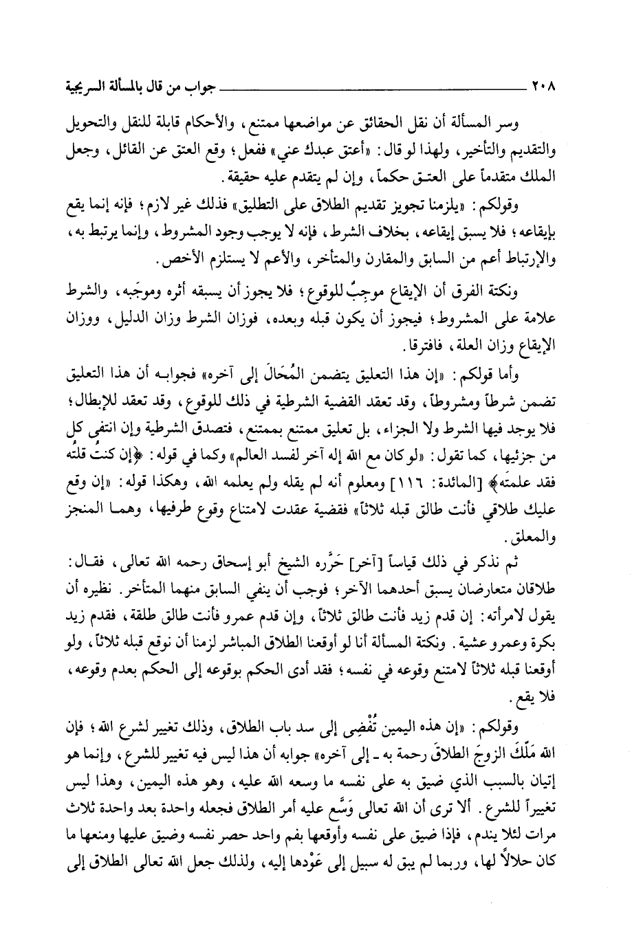 وَقَوْلُكُمْ: " يَلْزَمُنَا تَجْوِيزُ تَقْدِيمِ الطَّلَاقِ عَلَى التَّطْلِيقِ " فَذَلِكَ غَيْرُ لَازِمٍ؛ فَإِنَّهُ إنَّمَا يَقَعُ بِإِيقَاعِهِ؛ فَلَا يَسْبِقُ إيقَاعَهُ، بِخِلَافِ الشَّرْطِ، فَإِنَّهُ لَا يُوجِبُ وُجُودَ الْمَشْرُوطِ، وَإِنَّمَا يَرْتَبِطُ بِهِ، وَالِارْتِبَاطُ أَعَمُّ مِنْ السَّابِقِ وَالْمُقَارِنِ وَالْمُتَأَخِّرِ، وَالْأَعَمُّ لَا يَسْتَلْزِمُ الْأَخَصَّ.
