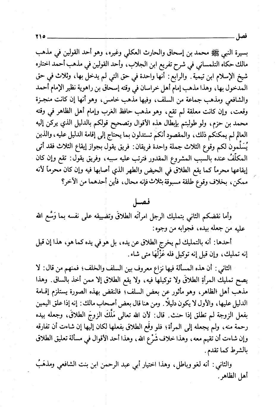 وَالرَّابِعُ: أَنَّهَا وَاحِدَةٌ فِي حَقِّ الَّتِي لَمْ يَدْخُلْ بِهَا، وَثَلَاثٌ فِي حَقِّ الْمَدْخُولِ بِهَا، وَهَذَا مَذْهَبُ إمَامِ أَهْلِ خُرَاسَانَ فِي وَقْتِهِ إِسْحَاقَ بْنِ رَاهْوَيْهِ نَظِيرِ الْإِمَامِ أَحْمَدَ وَالشَّافِعِيِّ وَمَذْهَبُ جَمَاعَةٍ مِنْ السَّلَفِ، وَفِيهَا مَذْهَبٌ خَامِسٌ، وَهُوَ أَنَّهَا إنْ كَانَتْ مُنَجَّزَةً وَقَعَتْ، وَإِنْ كَانَتْ مُعَلَّقَةً لَمْ تَقَعْ، وَهُوَ مَذْهَبُ حَافِظِ الْغَرْبِ وَإِمَامِ أَهْلِ الظَّاهِرِ فِي وَقْتِهِ أَبُو مُحَمَّدِ بْنِ حَزْمٍ، وَلَوْ طُولِبْتُمْ بِإِبْطَالِ هَذِهِ الْأَقْوَالِ وَتَصْحِيحِ قَوْلِكُمْ بِالدَّلِيلِ الَّذِي يَرْكَنُ إلَيْهِ الْعَالِمُ لَمْ يُمْكِنْكُمْ ذَلِكَ، وَالْمَقْصُودُ أَنَّكُمْ تَسْتَدِلُّونَ بِمَا يَحْتَاجُ إلَى إقَامَةِ الدَّلِيلِ عَلَيْهِ، وَاَلَّذِينَ يُسَلِّمُونَ لَكُمْ وُقُوعَ الثَّلَاثِ جُمْلَةً وَاحِدَةً فَرِيقَانِ: فَرِيقٌ يَقُولُ بِجَوَازِ إيقَاعِ الثَّلَاثِ فَقَدْ أَتَى الْمُكَلَّفُ عِنْدَهُ بِالسَّبَبِ الْمَشْرُوعِ الْمَقْدُورِ فَتَرَتَّبَ عَلَيْهِ سَبَبُهُ، وَفَرِيقٌ يَقُولُ: تَقَعُ وَإِنْ كَانَ إيقَاعُهَا مُحَرَّمًا كَمَا يَقَعُ الطَّلَاقُ فِي الْحَيْضِ وَالطُّهْرِ الَّذِي أَصَابَهَا فِيهِ، وَإِنْ كَانَ مُحَرَّمًا لِأَنَّهُ مُمْكِنٌ، بِخِلَافِ وُقُوعِ طَلْقَةٍ مَسْبُوقَةٍ بِثَلَاثٍ فَإِنَّهُ مُحَالٌ، فَأَيْنَ أَحَدُهُمَا مِنْ الْآخَرِ؟ فَصْلٌ