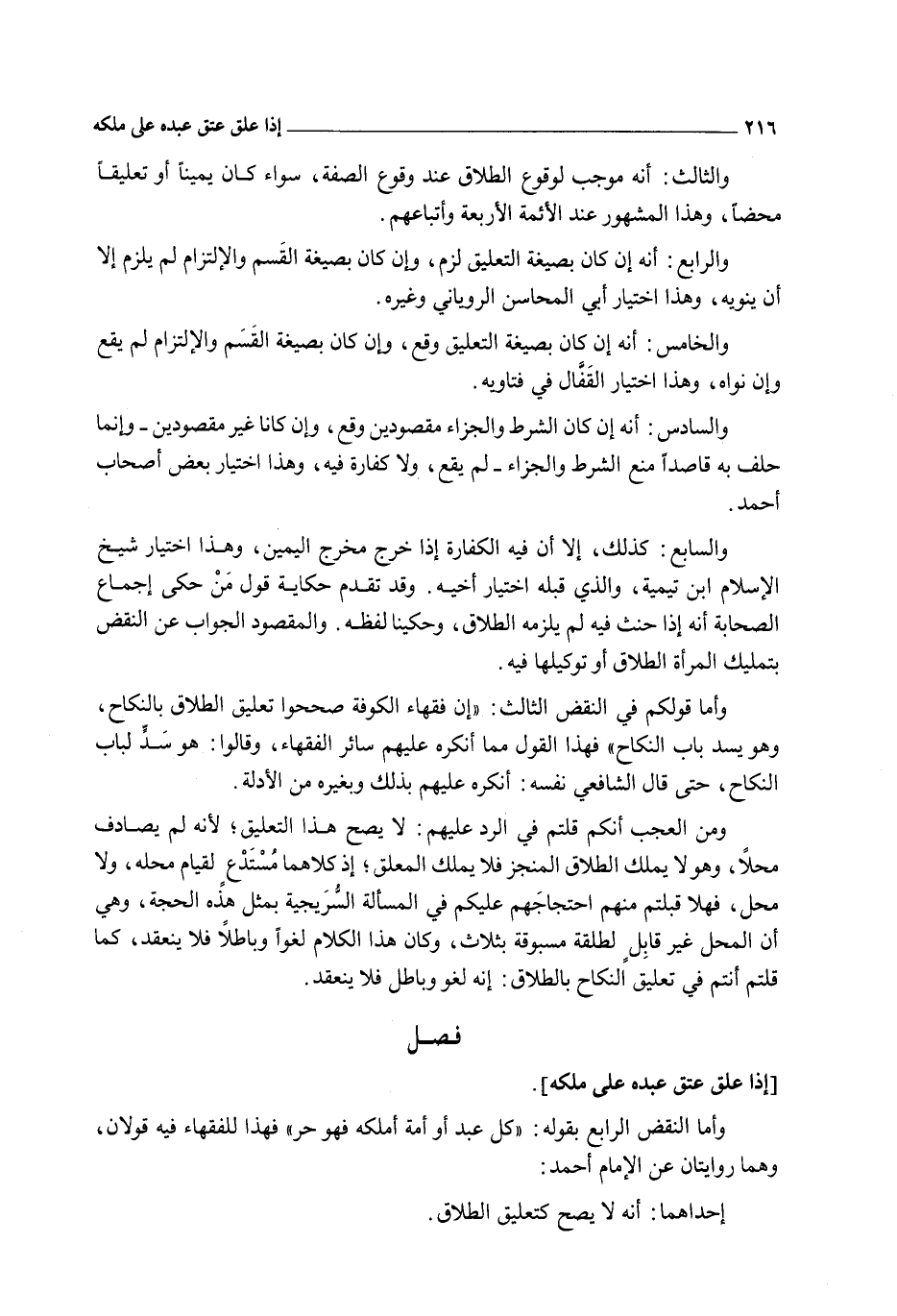 وَأَمَّا النَّقْضُ الرَّابِعُ بِقَوْلِهِ: " كُلُّ عَبْدٍ أَوْ أَمَةٍ أَمْلِكُهُ فَهُوَ حُرٌّ " فَهَذَا لِلْفُقَهَاءِ فِيهِ قَوْلَانِ، وَهُمَا رِوَايَتَانِ عَنْ الْإِمَامِ أَحْمَدَ: إحْدَاهُمَا: أَنَّهُ لَا يَصِحُّ كَتَعْلِيقِ الطَّلَاقِ.