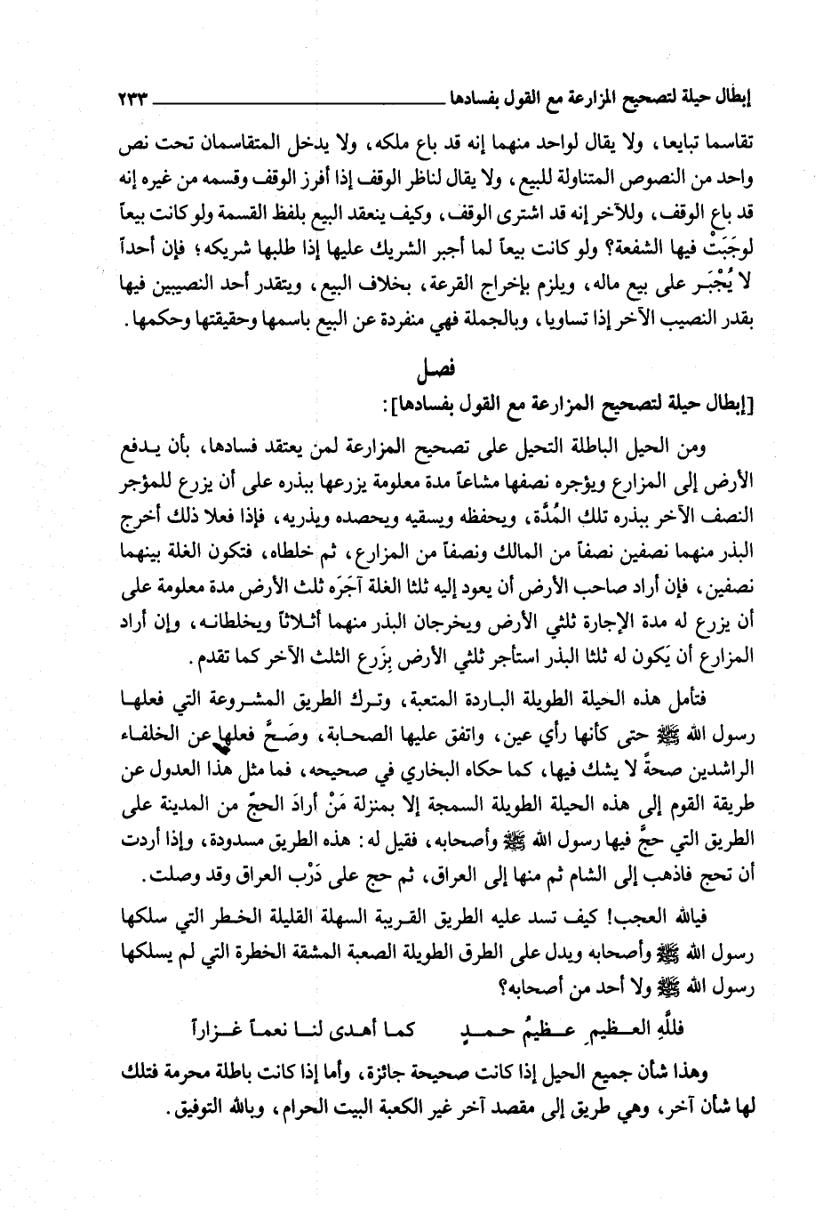 [إبْطَالُ حِيلَةٍ لِتَصْحِيحِ الْمُزَارَعَةِ مَعَ الْقَوْلِ بِفَسَادِهَا] : وَمِنْ الْحِيَلِ الْبَاطِلَةِ التَّحَيُّلُ عَلَى تَصْحِيحِ الْمُزَارَعَةِ لِمَنْ يَعْتَقِدُ فَسَادَهَا، بِأَنْ يَدْفَعَ الْأَرْضَ إلَى الْمُزَارِعِ وَيُؤَجِّرَهُ نِصْفَهَا مَشَاعًا مُدَّةً مَعْلُومَةً يَزْرَعُهَا بِبَذْرِهِ عَلَى أَنْ يَزْرَعَ لِلْمُؤَجِّرِ النِّصْفَ الْآخَرَ بِبَذْرِهِ تِلْكَ الْمُدَّةِ، وَيَحْفَظَهُ وَيَسْقِيَهُ وَيَحْصُدَهُ وَيُذَرِّيَهُ، فَإِذَا فَعَلَا ذَلِكَ أُخْرِجَ الْبَذْرُ مِنْهُمَا نِصْفَيْنِ نِصْفًا مِنْ الْمَالِكِ وَنِصْفًا مِنْ الْمُزَارِعِ، ثُمَّ خَلَطَاهُ، فَتَكُونُ الْغَلَّةُ بَيْنَهُمَا نِصْفَيْنِ، فَإِنْ أَرَادَ صَاحِبُ الْأَرْضِ أَنْ يَعُودَ إلَيْهِ ثُلُثَا الْغَلَّةِ آجَرَهُ ثُلُثَ الْأَرْضِ مُدَّةً مَعْلُومَةً عَلَى أَنْ يَزْرَعَ لَهُ مُدَّةَ الْإِجَارَةِ ثُلُثَيْ الْأَرْضِ وَيُخْرِجَانِ الْبَذْرَ مِنْهُمَا أَثْلَاثًا وَيَخْلِطَانِهِ، وَإِنْ أَرَادَ الْمُزَارِعُ أَنْ يَكُونَ لَهُ ثُلُثَا الْبَذْرِ اسْتَأْجَرَ ثُلُثَيْ الْأَرْضِ بِزَرْعِ الثُّلُثِ الْآخَرِ كَمَا تَقَدَّمَ.