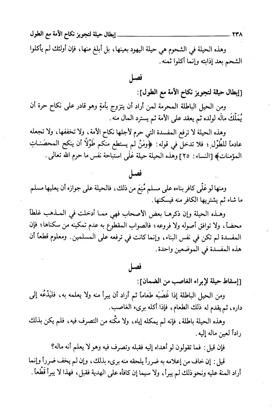 [إبْطَالُ حِيلَةٍ لِتَجْوِيزِ نِكَاحِ الْأَمَةِ مَعَ الطَّوْلِ] : وَمِنْ الْحِيَلِ الْبَاطِلَةِ الْمُحَرَّمَةِ لِمَنْ أَرَادَ أَنْ يَتَزَوَّجَ بِأَمَةٍ وَهُوَ قَادِرٌ عَلَى نِكَاحِ حُرَّةٍ أَنْ يُمَلِّكَ مَالَهُ لِوَلَدِهِ ثُمَّ يَعْقِدَ عَلَى الْأَمَةِ ثُمَّ يَسْتَرِدَّ الْمَالَ مِنْهُ.