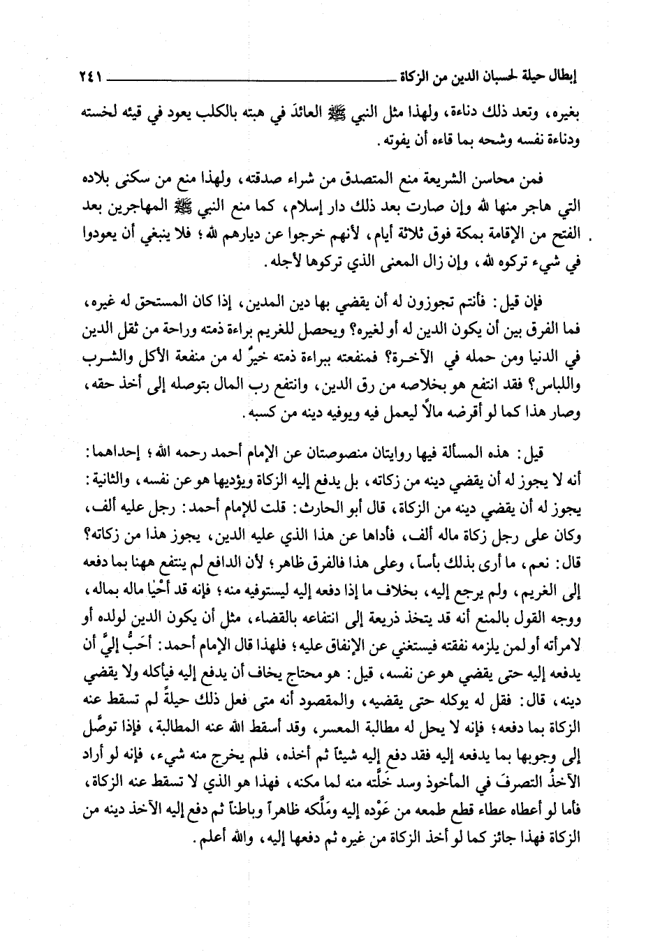 قَالَ: فَقُلْ لَهُ يُوَكِّلُهُ حَتَّى يَقْضِيَهُ، وَالْمَقْصُودُ أَنَّهُ مَتَى فَعَلَ ذَلِكَ حِيلَةً لَمْ تَسْقُطْ عَنْهُ الزَّكَاةُ بِمَا دَفَعَهُ؛ فَإِنَّهُ لَا يَحِلُّ لَهُ مُطَالَبَةُ الْمُعْسِرِ، وَقَدْ أَسْقَطَ اللَّهُ عَنْهُ الْمُطَالَبَةَ، فَإِذَا تَوَصَّلَ إلَى وُجُوبِهَا بِمَا يَدْفَعُهُ إلَيْهِ فَقَدْ دَفَعَ إلَيْهِ شَيْئًا ثُمَّ أَخَذَهُ، فَلَمْ يَخْرُجْ مِنْهُ شَيْءٌ، فَإِنَّهُ لَوْ أَرَادَ الْآخِذُ التَّصَرُّفَ فِي الْمَأْخُوذِ وَسَدَّ خَلَّتَهُ مِنْهُ لَمَا مَكَّنَهُ، فَهَذَا هُوَ الَّذِي لَا تَسْقُطُ عَنْهُ الزَّكَاةُ، فَأَمَّا لَوْ أَعْطَاهُ عَطَاءً قَطَعَ طَمَعَهُ مِنْ عَوْدِهِ إلَيْهِ وَمَلَّكَهُ ظَاهِرًا وَبَاطِنًا ثُمَّ دَفَعَ إلَيْهِ الْآخِذُ دَيْنَهُ مِنْ الزَّكَاةِ فَهَذَا جَائِزٌ كَمَا لَوْ أَخَذَ الزَّكَاةَ مِنْ غَيْرِهِ ثُمَّ دَفَعَهَا إلَيْهِ، وَاَللَّهُ أَعْلَمُ.