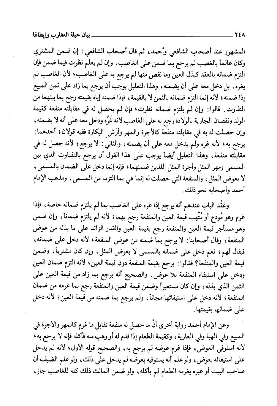 وَعَنْ الْإِمَامِ أَحْمَدَ رِوَايَةٌ أُخْرَى أَنَّ مَا حَصَلَ لَهُ مَنْفَعَةٌ تُقَابِلُ مَا غَرِمَ كَالْمَهْرِ وَالْأُجْرَةِ فِي الْمَبِيعِ وَفِي الْهِبَةِ وَفِي الْعَارِيَّةِ، وَكَقِيمَةِ الطَّعَامِ إذَا قُدِّمَ لَهُ أَوْ وُهِبَ مِنْهُ فَأَكَلَهُ فَإِنَّهُ لَا يَرْجِعُ بِهِ؛ لِأَنَّهُ اسْتَوْفَى الْعِوَضَ، فَإِذَا غَرِمَ عِوَضَهُ لَمْ يَرْجِعْ بِهِ، وَالصَّحِيحُ قَوْلُهُ الْأَوَّلُ؛ لِأَنَّهُ لَمْ يَدْخُلْ عَلَى اسْتِيفَائِهِ بِعِوَضٍ، وَلَوْ عَلِمَ أَنَّهُ يَسْتَوْفِيهِ بِعِوَضِهِ لَمْ يَدْخُلْ عَلَى ذَلِكَ، وَلَوْ عَلِمَ الضَّيْفُ أَنَّ صَاحِبَ الْبَيْتِ أَوْ غَيْرَهُ يُغَرِّمُهُ الطَّعَامَ لَمْ يَأْكُلْهُ، وَلَوْ ضَمِنَ الْمَالِكُ ذَلِكَ كُلَّهُ لِلْغَاصِبِ جَازَ،