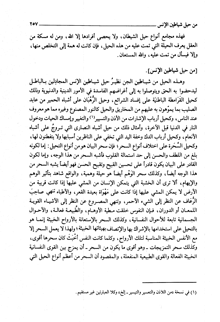 وَهَذِهِ الْحِيَلُ مِنْ شَيَاطِينِ الْجِنِّ نَظِيرُ حِيَلِ شَيَاطِينِ الْإِنْسِ الْمُجَادِلِينَ بِالْبَاطِلِ لِيُدْحِضُوا بِهِ الْحَقَّ وَيَتَوَصَّلُوا بِهِ إلَى أَغْرَاضِهِمْ الْفَاسِدَةِ فِي الْأُمُورِ الدِّينِيَّةِ وَالدُّنْيَوِيَّةِ وَذَلِكَ كَحِيَلِ الْقَرَامِطَةِ الْبَاطِنِيَّةِ عَلَى إفْسَادِ الشَّرَائِعِ، وَحِيَلِ الرُّهْبَانِ عَلَى أَشْبَاهِ الْحَمِيرِ مِنْ عَابِدِ الصَّلِيبِ بِمَا يُمَوِّهُونَ بِهِ عَلَيْهِمْ مِنْ الْمَخَارِيقِ وَالْحِيَلِ كَالنُّورِ الْمَصْنُوعِ وَغَيْرِهِ مِمَّا هُوَ مَعْرُوفٌ عِنْدَ النَّاسِ، وَكَحِيَلِ أَرْبَابِ الْإِشَارَاتِ مِنْ الْإِذْنَ وَالتَّسْيِيرِ وَالتَّغْيِيرِ وَإِمْسَاكِ الْحَيَّاتِ وَدُخُولِ النَّارِ فِي الدُّنْيَا قَبْلَ الْآخِرَةِ، وَأَمْثَالِ ذَلِكَ مِنْ حِيَلِ أَشْبَاهِ النَّصَارَى الَّتِي تَرُوجُ عَلَى أَشْبَاهِ الْأَنْعَامِ، وَكَحِيَلِ أَرْبَابِ الدَّكِّ وَخِفَّةِ الْيَدِ الَّتِي تَخْفَى عَلَى النَّاظِرِينَ أَسْبَابُهَا وَلَا يَتَفَطَّنُونَ لَهَا، وَكَحِيَلِ السَّحَرَةِ عَلَى اخْتِلَافِ أَنْوَاعِ السِّحْرِ؛ فَإِنَّ سِحْرَ الْبَيَانِ هُوَ مِنْ أَنْوَاعِ التَّحَيُّلِ: إمَّا لِكَوْنِهِ بَلَغَ مِنْ اللُّطْفِ وَالْحُسْنِ إلَى حَدِّ اسْتِمَالَةِ الْقُلُوبِ فَأَشْبَهَ السِّحْرَ مِنْ هَذَا الْوَجْهِ، وَإِمَّا لِكَوْنِ الْقَادِرِ عَلَى الْبَيَانِ يَكُونُ قَادِرًا عَلَى تَحْسِينِ الْقَبِيحِ وَتَقْبِيحِ الْحَسَنِ فَهُوَ أَيْضًا يُشْبِهُ السِّحْرَ مِنْ هَذَا الْوَجْهِ أَيْضًا.