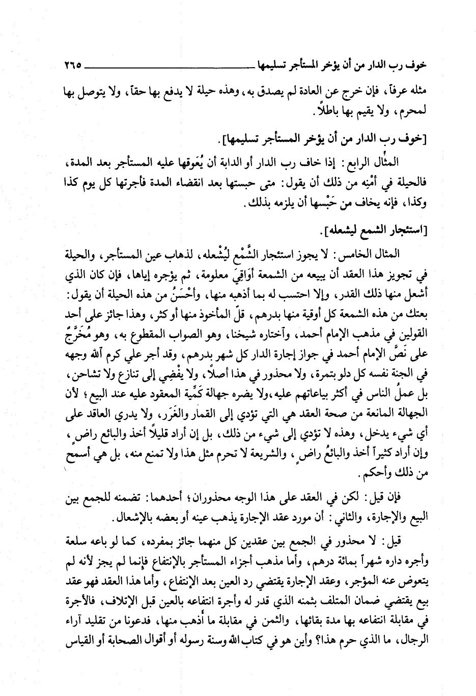 الْمِثَالُ الْخَامِسُ: لَا يَجُوزُ اسْتِئْجَارُ الشَّمْعِ لِيُشْعِلَهُ، لِذَهَابِ عَيْنِ الْمُسْتَأْجَرِ، وَالْحِيلَةُ فِي تَجْوِيزِ هَذَا الْعَقْدِ أَنْ يَبِيعَهُ مِنْ الشَّمْعَةِ أَوَاقِيَّ مَعْلُومَةً، ثُمَّ يُؤَجِّرَهُ إيَّاهَا، فَإِنْ كَانَ الَّذِي أَشْعَلَ مِنْهَا ذَلِكَ الْقَدْرَ، وَإِلَّا احْتَسَبَ لَهُ بِمَا أَذْهَبَهُ مِنْهَا، وَأَحْسَنُ مِنْ هَذِهِ الْحِيلَةِ أَنْ يَقُولَ: بِعْتُك مِنْ هَذِهِ الشَّمْعَةِ كُلَّ أُوقِيَّةٍ مِنْهَا بِدِرْهَمٍ، قَلَّ الْمَأْخُوذُ مِنْهَا أَوْ كَثُرَ، وَهَذَا جَائِزٌ عَلَى أَحَدِ الْقَوْلَيْنِ فِي مَذْهَبِ الْإِمَامِ أَحْمَدَ، وَاخْتَارَهُ شَيْخُنَا، وَهُوَ الصَّوَابُ الْمَقْطُوعُ بِهِ، وَهُوَ مُخَرَّجٌ عَلَى نَصِّ الْإِمَامِ أَحْمَدَ فِي جَوَازِ إجَارَةِ الدَّارِ كُلَّ شَهْرٍ بِدِرْهَمٍ، وَقَدْ أَجَرَ عَلِيٌّ كَرَّمَ اللَّهُ وَجْهَهُ فِي الْجَنَّةِ نَفْسَهُ كُلَّ دَلْوٍ بِتَمْرَةٍ، وَلَا مَحْذُورَ فِي هَذَا أَصْلًا، وَلَا يُفْضِي إلَى تَنَازُعٍ وَلَا تَشَاحُنٍ، بَلْ عَمَلُ النَّاسِ فِي أَكْثَرِ بِيَاعَاتِهِمْ عَلَيْهِ، وَلَا يَضُرُّهُ جَهَالَةُ كَمْيَّةِ الْمَعْقُودِ عَلَيْهِ عِنْدَ الْبَيْعِ؛ لِأَنَّ الْجَهَالَةَ الْمَانِعَةَ مِنْ صِحَّةِ الْعَقْدِ هِيَ الَّتِي تُؤَدِّي إلَى الْقِمَارِ وَالْغَرَرِ، وَلَا يَدْرِي الْعَاقِدُ عَلَى أَيِّ شَيْءٍ يَدْخُلُ، وَهَذِهِ لَا تُؤَدِّي إلَى شَيْءٍ مِنْ ذَلِكَ، بَلْ إنْ أَرَادَ قَلِيلًا أَخَذَ وَالْبَائِعُ رَاضٍ، وَإِنْ أَرَادَ كَثِيرًا أَخَذَ وَالْبَائِعُ رَاضٍ، وَالشَّرِيعَةُ لَا تُحَرِّمُ مِثْلَ هَذَا وَلَا تَمْنَعُ مِنْهُ، بَلْ هِيَ أَسْمَحُ مِنْ ذَلِكَ وَأَحْكَمُ.