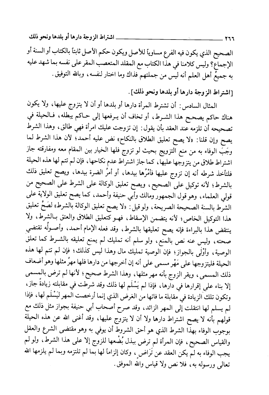 [الْمِثَالُ السَّادِسُ اشْتِرَاطُ الزَّوْجَةِ دَارَهَا أَوْ بَلَدَهَا وَنَحْوَ ذَلِكَ]