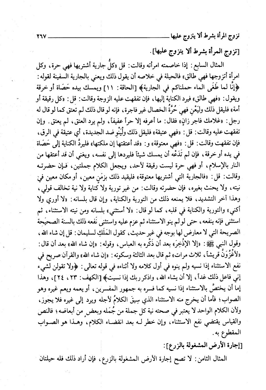 تَزَوُّجُ الْمَرْأَةِ بِشَرْطِ أَلَّا يَتَزَوَّجَ عَلَيْهَا] الْمِثَالُ السَّابِعُ: إذَا خَاصَمَتْهُ امْرَأَتُهُ وَقَالَتْ: قُلْ " كُلُّ جَارِيَةٍ أَشْتَرِيهَا فَهِيَ حُرَّةٌ، وَكُلُّ امْرَأَةٍ أَتَزَوَّجُهَا فَهِيَ طَالِقٌ " فَالْحِيلَةُ فِي خَلَاصِهِ أَنْ يَقُولَ ذَلِكَ وَيَعْنِي بِالْجَارِيَةِ السَّفِينَةَ لِقَوْلِهِ: {إِنَّا لَمَّا طَغَى الْمَاءُ حَمَلْنَاكُمْ فِي الْجَارِيَةِ} [الحاقة: 11] وَيُمْسِكُ بِيَدِهِ حَصَاةً أَوْ خِرْقَةً وَيَقُولُ: " فَهِيَ طَالِقٌ " فَيَرُدُّ الْكِنَايَةَ إلَيْهَا، فَإِنْ تَفَقَّهَتْ عَلَيْهِ الزَّوْجَةُ وَقَالَتْ: قُلْ: " كُلُّ رَقِيقَةٍ أَوْ أَمَةٍ " فَلِيَقُلْ ذَلِكَ وَلْيَعْنِ فَهِيَ حُرَّةُ الْخِصَالِ غَيْرُ فَاجِرَةٍ، فَإِنَّهُ لَوْ قَالَ ذَلِكَ لَمْ تُعْتَقْ كَمَا لَوْ قَالَ لَهُ رَجُلٌ: " غُلَامُك فَاجِرٌ زَانٍ " فَقَالَ: مَا أَعْرِفُهُ إلَّا حُرًّا عَفِيفًا، وَلَمْ يُرِدْ الْعِتْقَ، لَمْ يُعْتَقْ.
